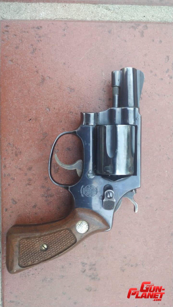 SMITH & WESSON 36: Cal. 38 Special. Capacidad de 5 tiros. Simple y doble acción. Cañón de 2". Alza fija . Terminación pavón (original 10 puntos, la foto puede engañar) . Cachas anatómicas de madera.