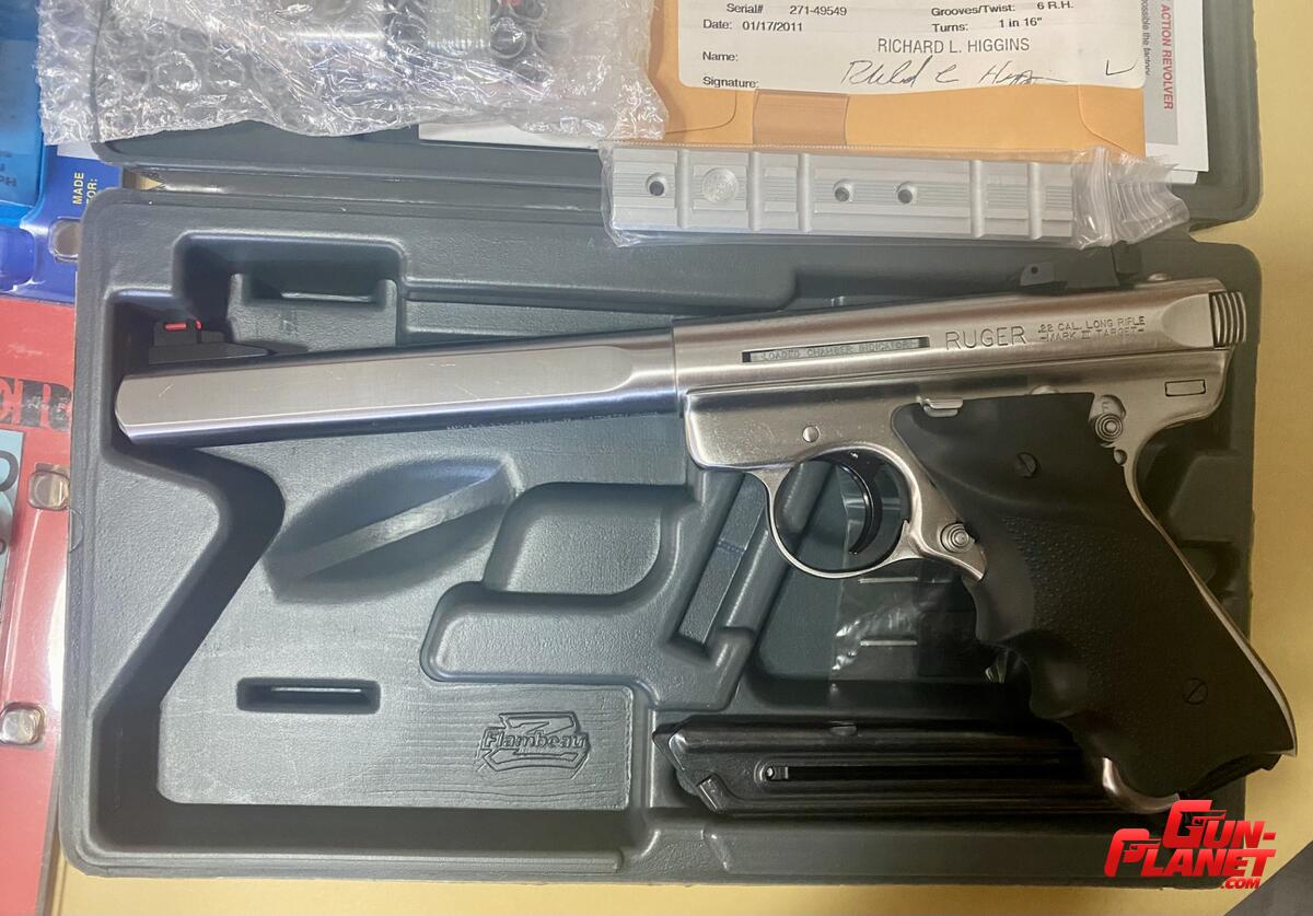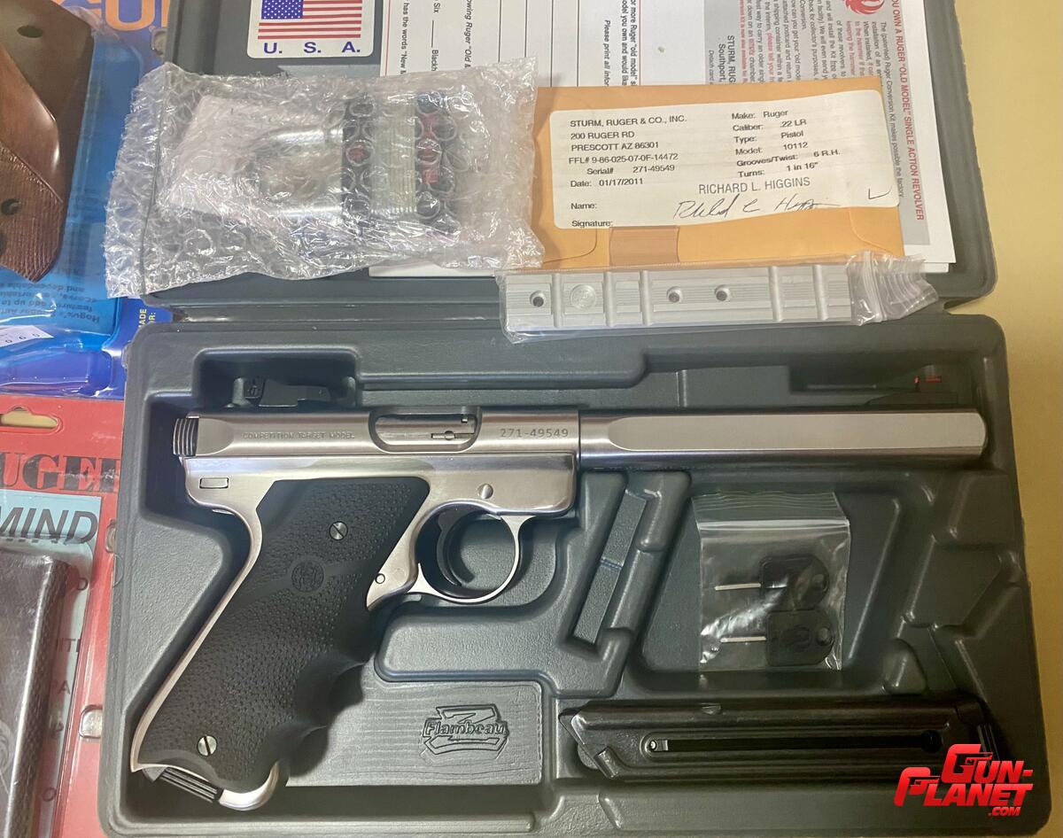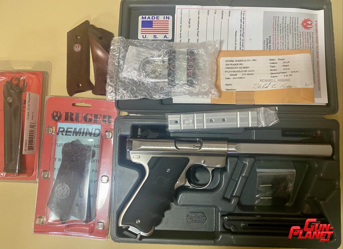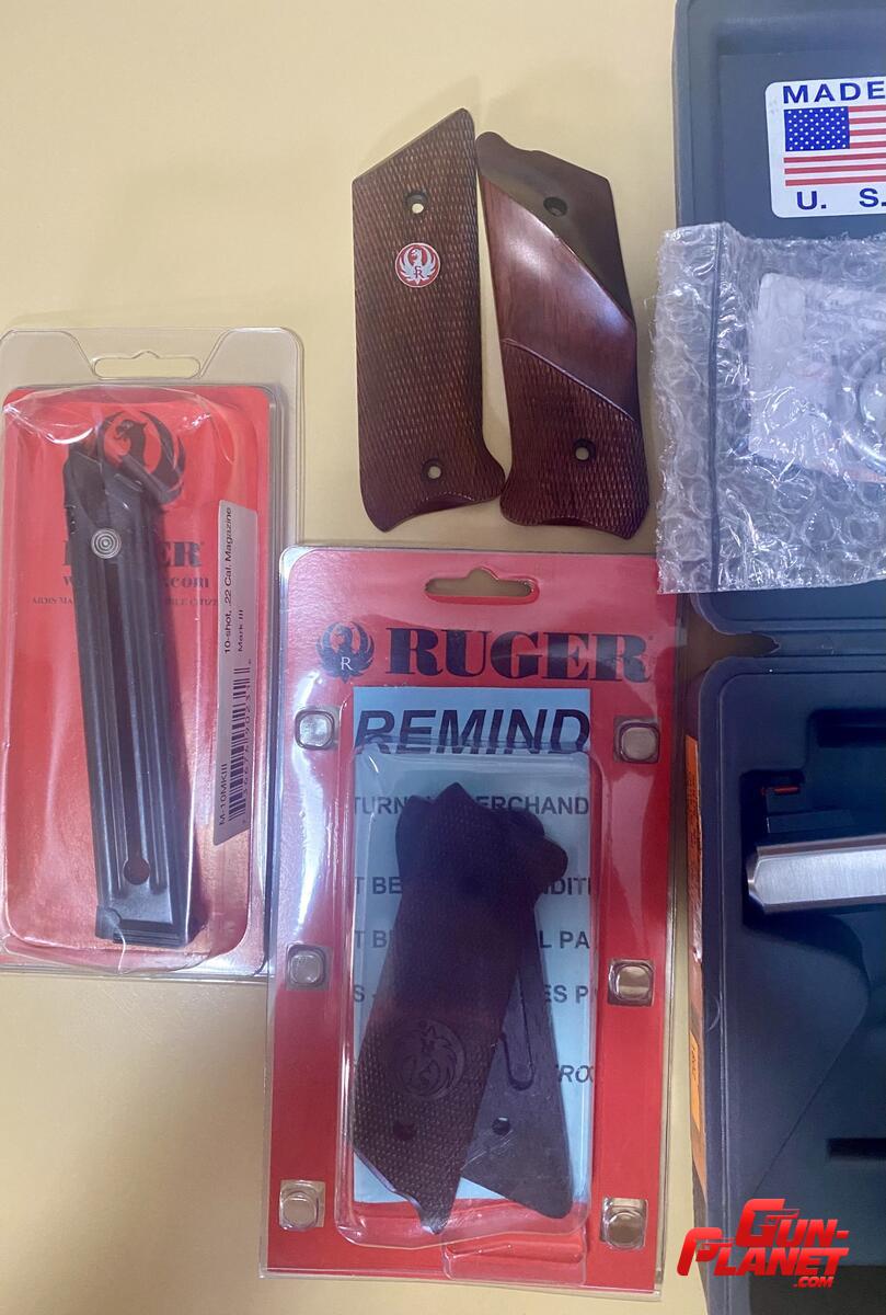 3 juegos de cachas (Hogue, madera anatomica Ruger y madera convencional Ruger).