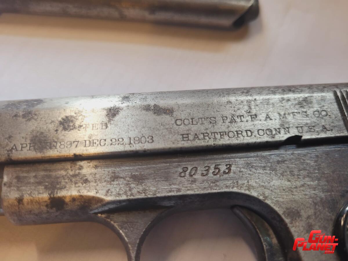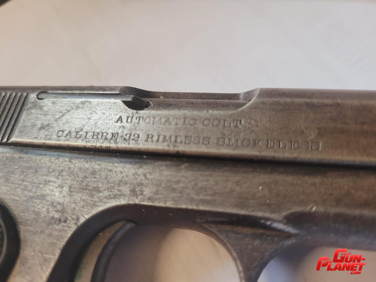Lleva en el lado izquierdo de la corredera PATENT APRIL. 20.1897. DEC.22.1903. COLT´S PAT. F.A. M.F.G. CO. HARTFORD CONN. U.S.A. Y en el derecho: COLT AUTOMATIC CALIBRE .32 RIMLESS SMOKELESS.