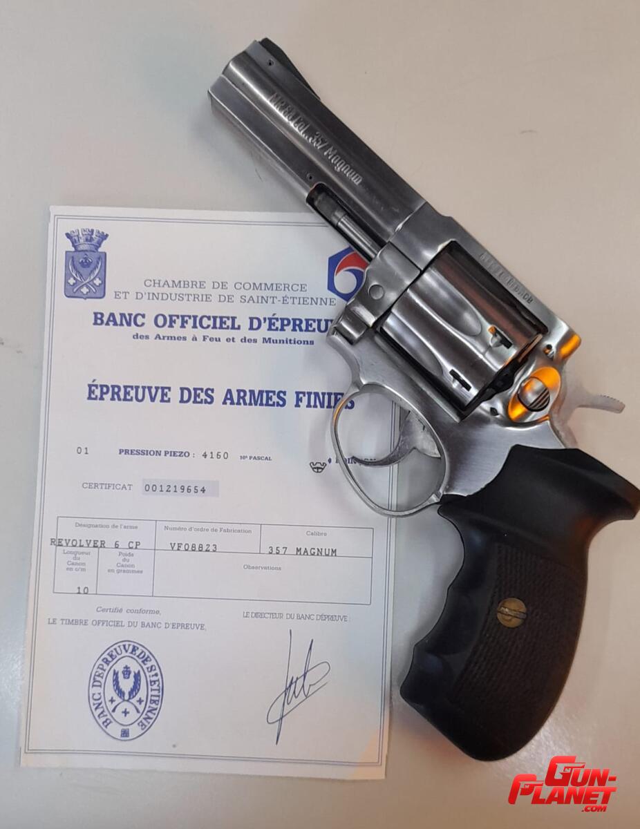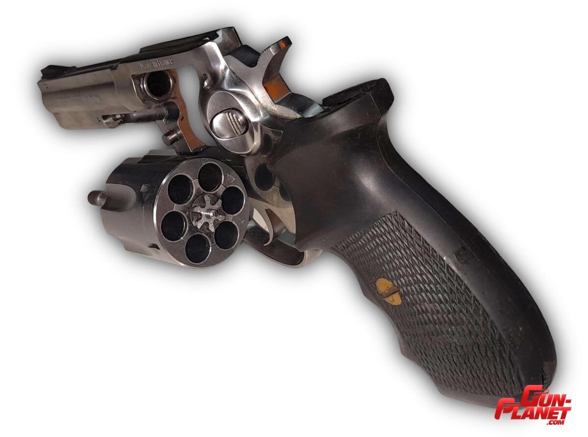 Caño de 4", tambor para 6 cartuchos cal. .357 Magnum y grip de goma anatómico.