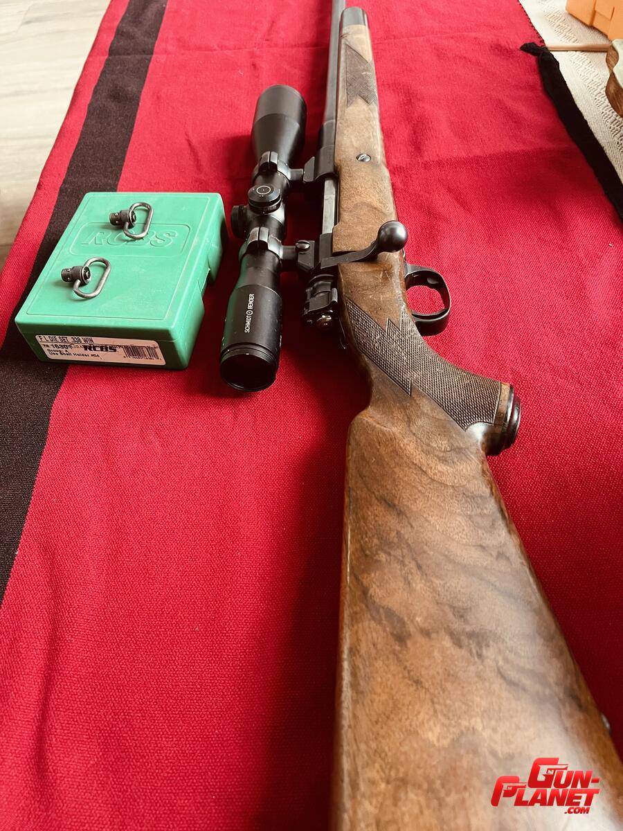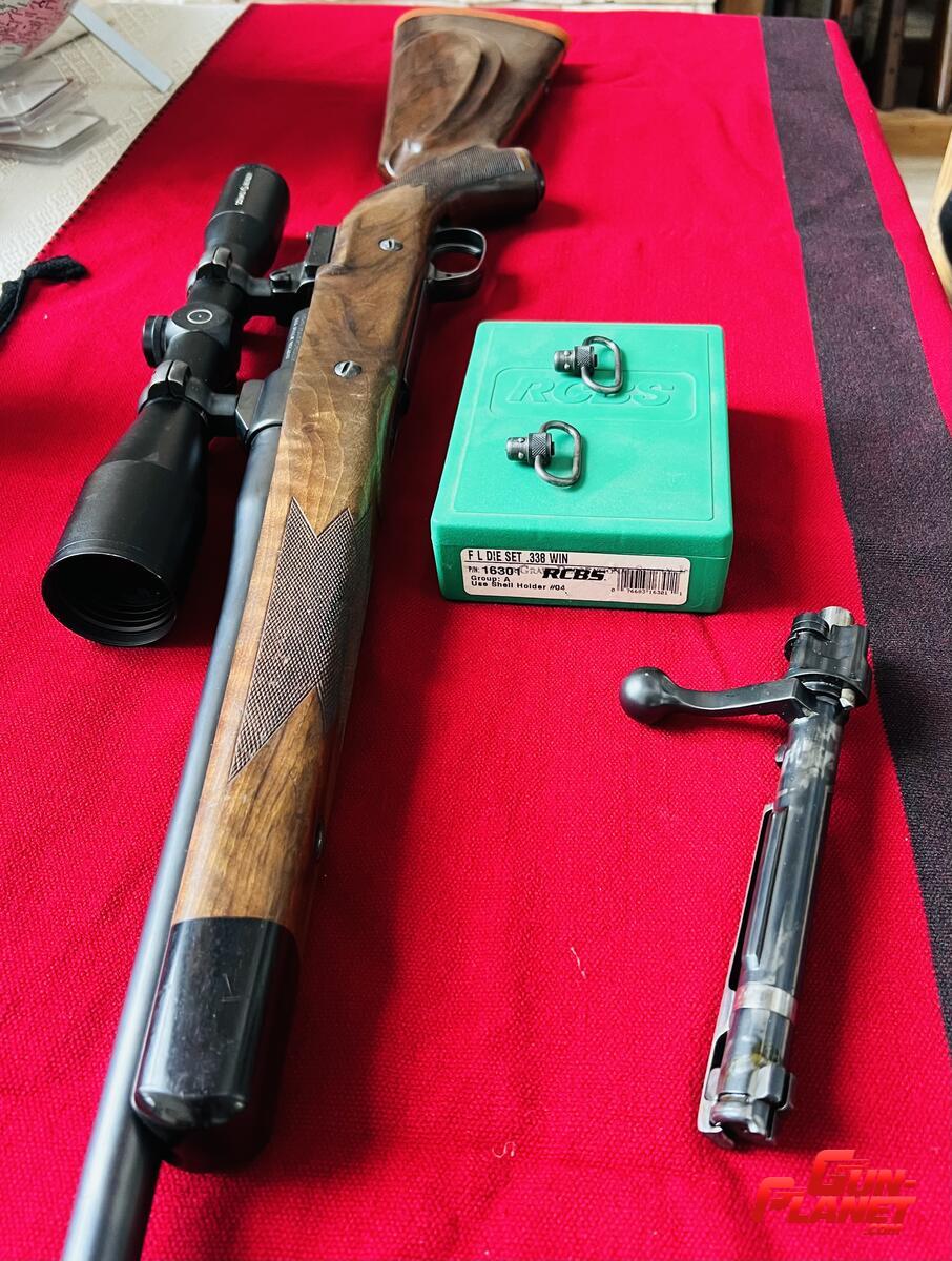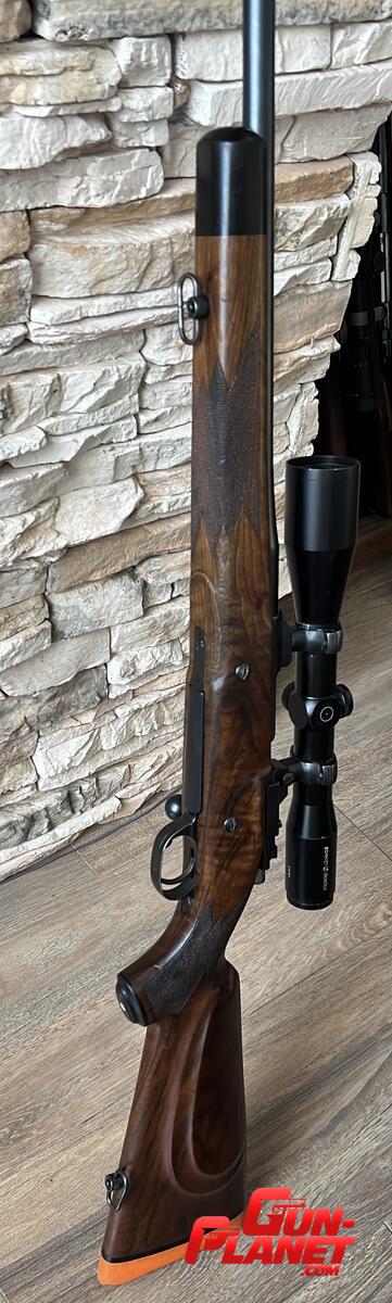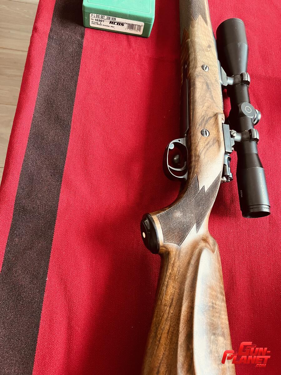 Mauser 1909 338 WM armado por el maestro armero Alfredo Caggiano. Excelente culata de raíz de Nogal.