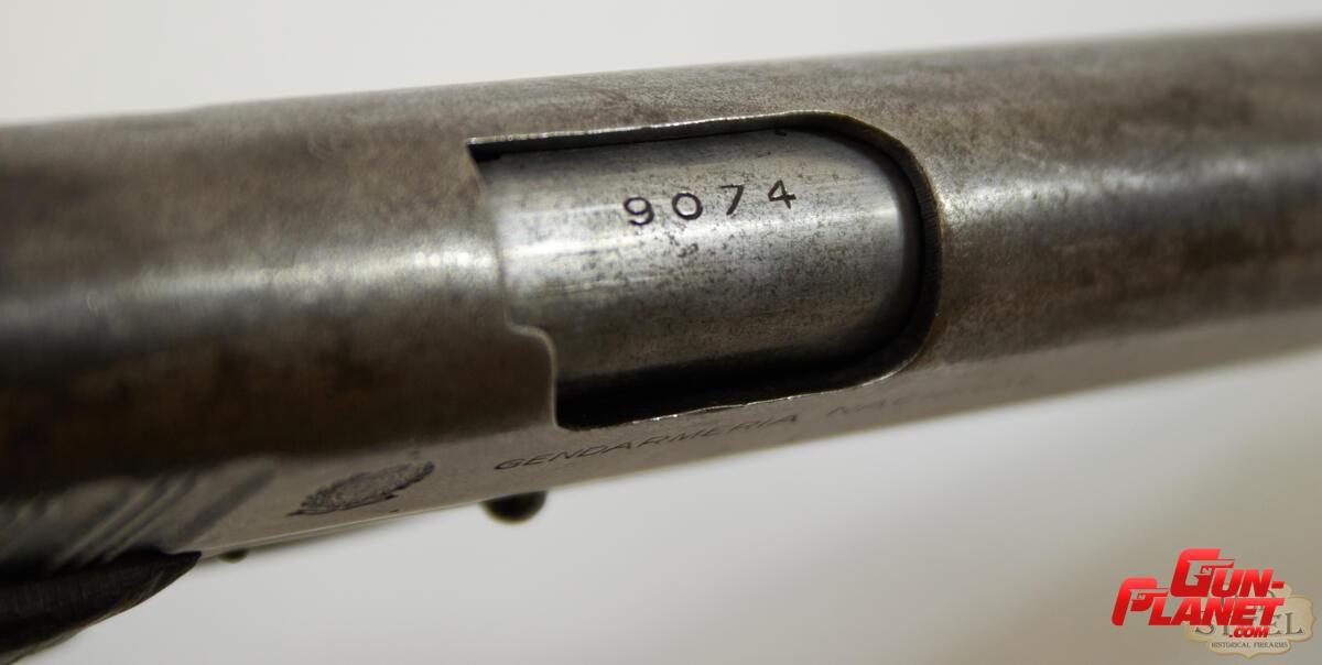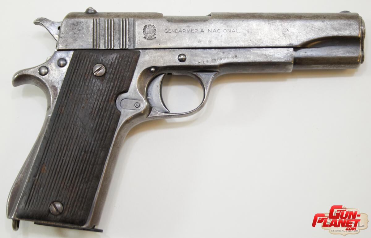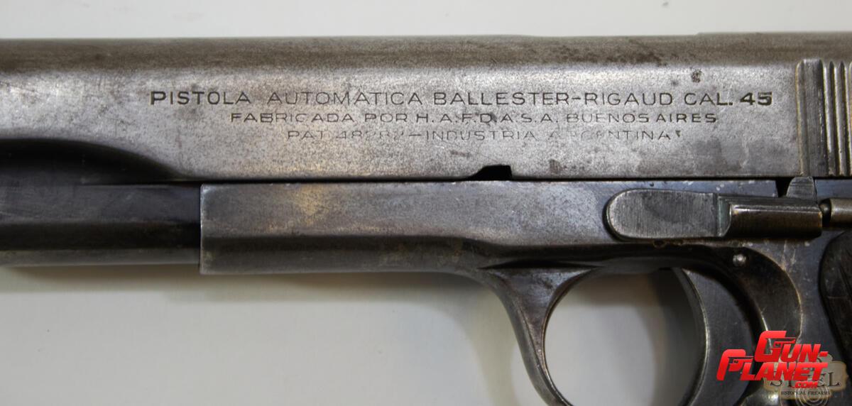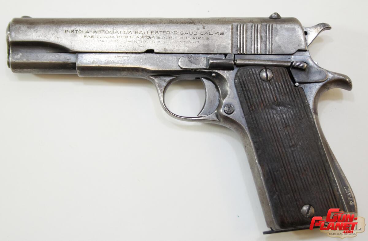 Up for auction is an Argentine made Ballester Rigaud pistol chambered in 45 ACP. This 1911 lookalike pistol features a slightly modified but equally reliable action to that of the famous browning pistol. It takes the same magazines as the 1911 and is chambered in the venerable 45 ACP just like its American cousin. The barrel measures 5 inches and has sharp defined rifling. The action is nice and smooth, and this pistol also bears the mark of the national gendarmery, since all of these pistols were engraved with the branch of service that they served with. Overall a really cool pistol with a lot of history and a must have for any Argentine arms collector.