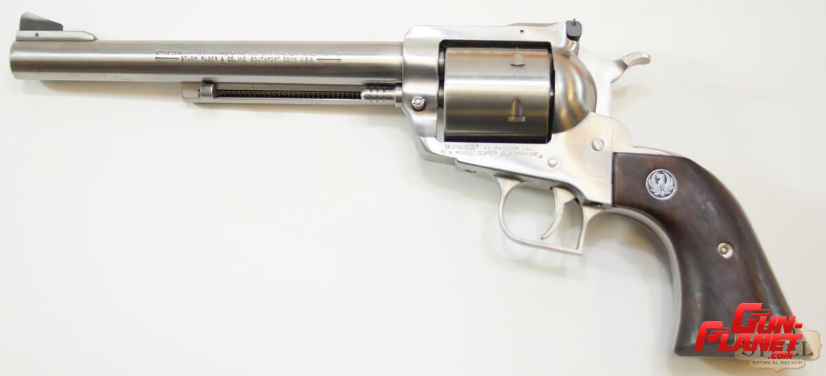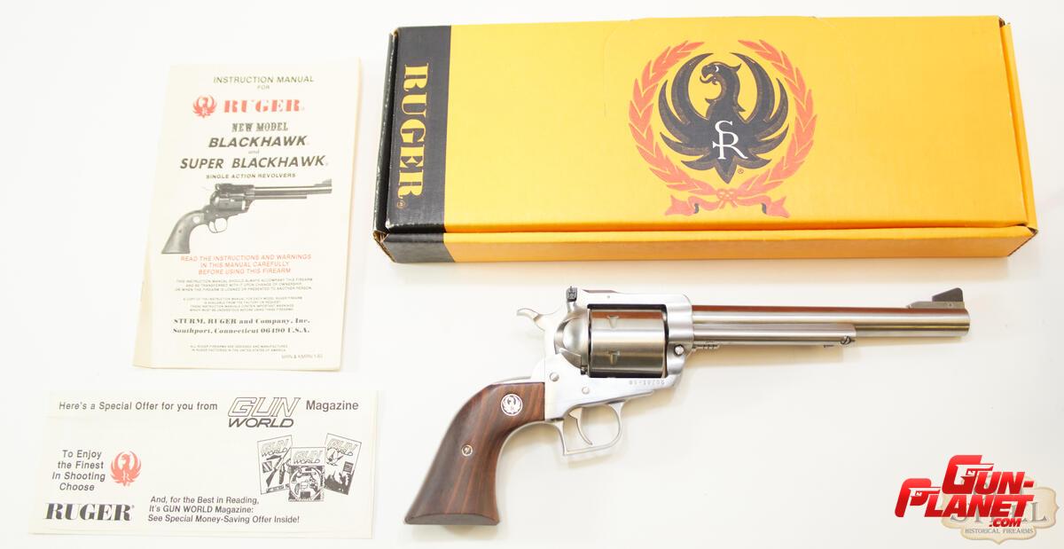 Up for Auction is a Beautiful Ruger New Model Super Blackhawk Chambered in 44 Magnum. This revolver features a 7.5 inch barrel with sharp reflective rifling. The action is buttery smooth, it locks up solidly, and times well. The wooden grips are in great shape but stick out a tiny bit, and the finish shows little to no signs of use and wear. A must have for any hunters or fans of the single action army platform.