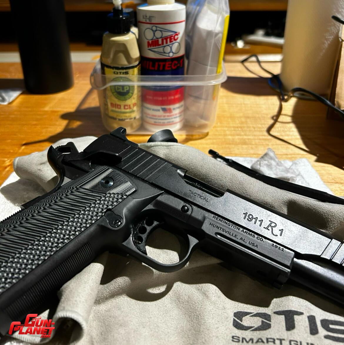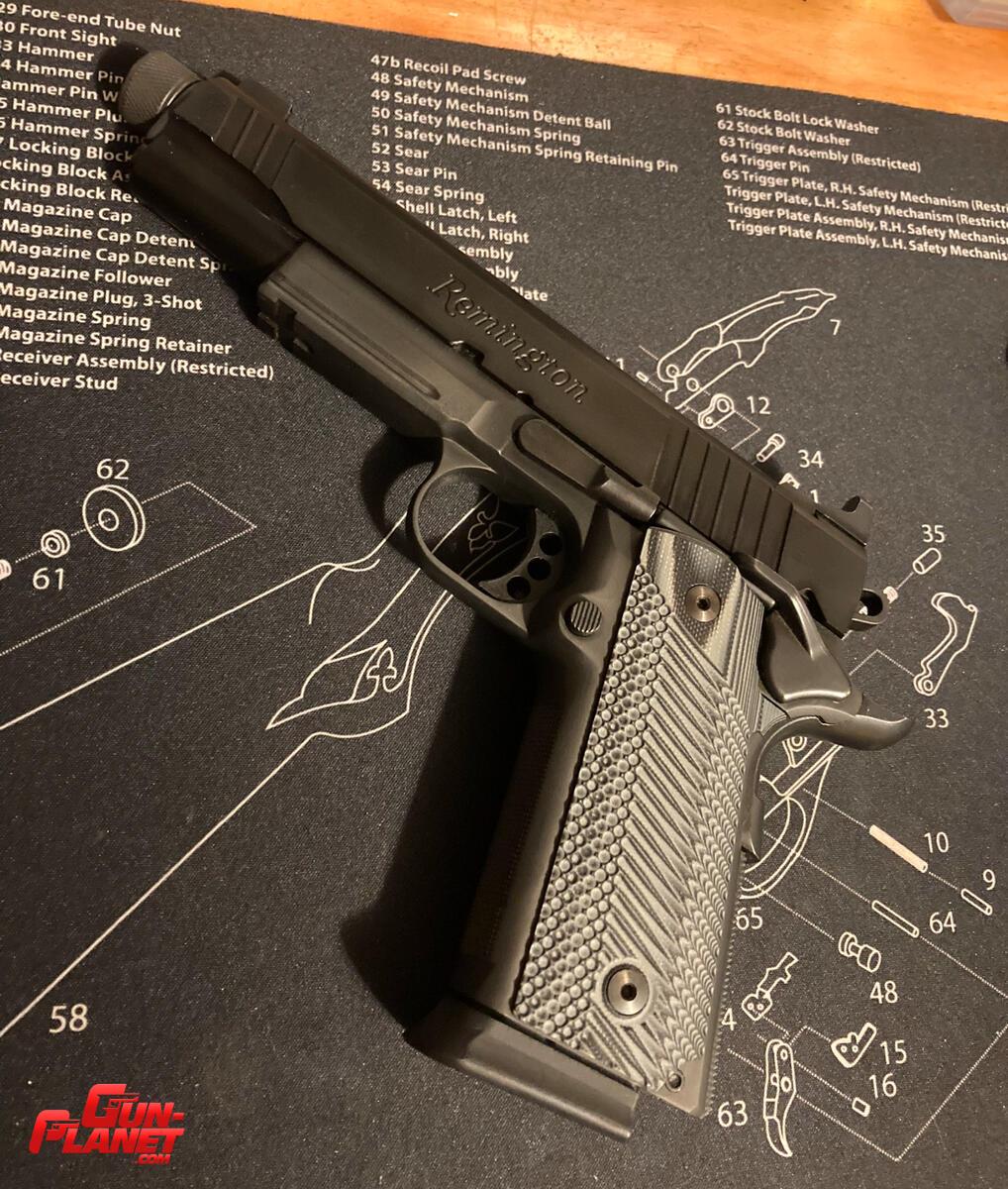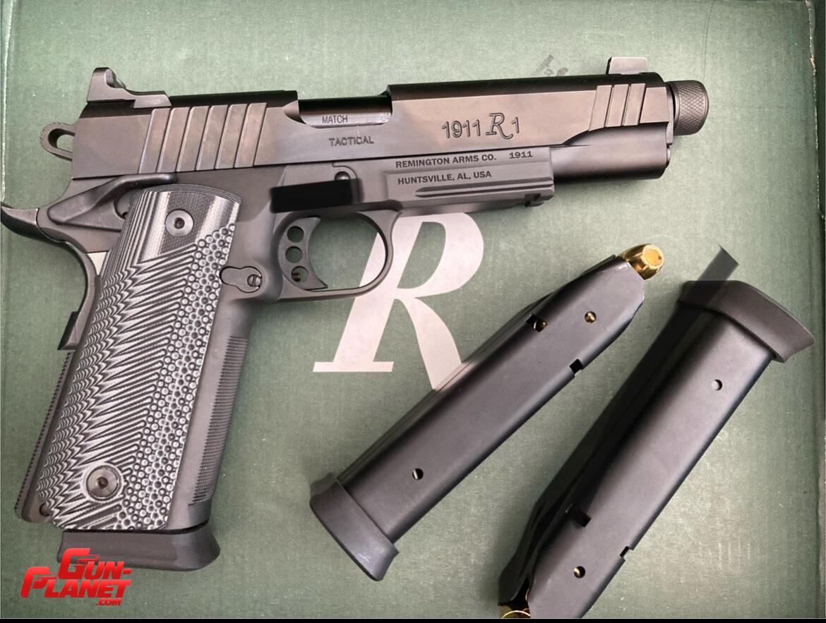 Pistola 1911 de la marca Remington, Modelo R1 Tactical. 3 cargadores doble hilera de 14 cartuchos de capacidad, cañón match en acero inoxidable y roscado, miras Trijicon, cola de disparador esqueletonizada regulable, cachas G10, riel picattiny, etc.