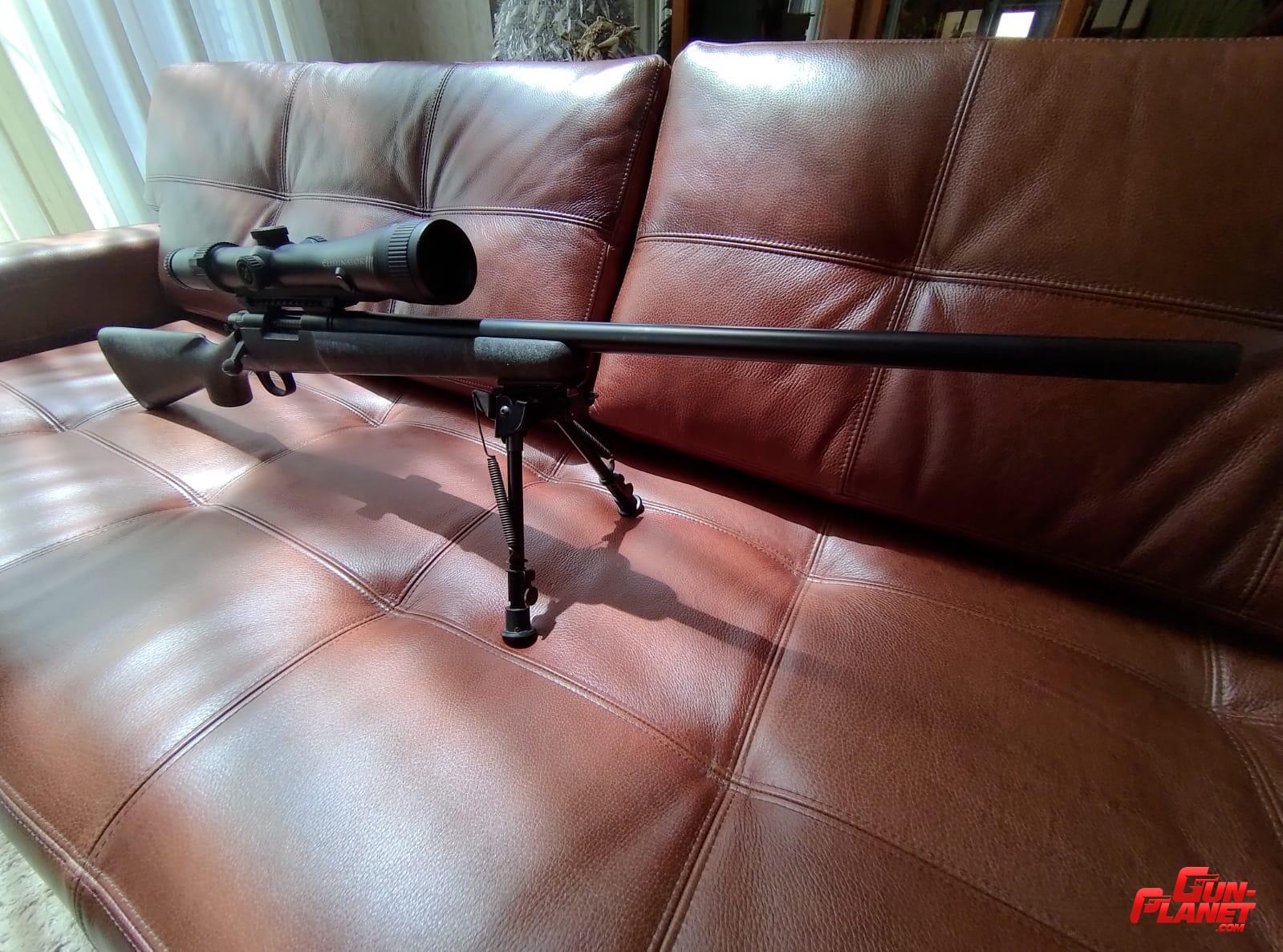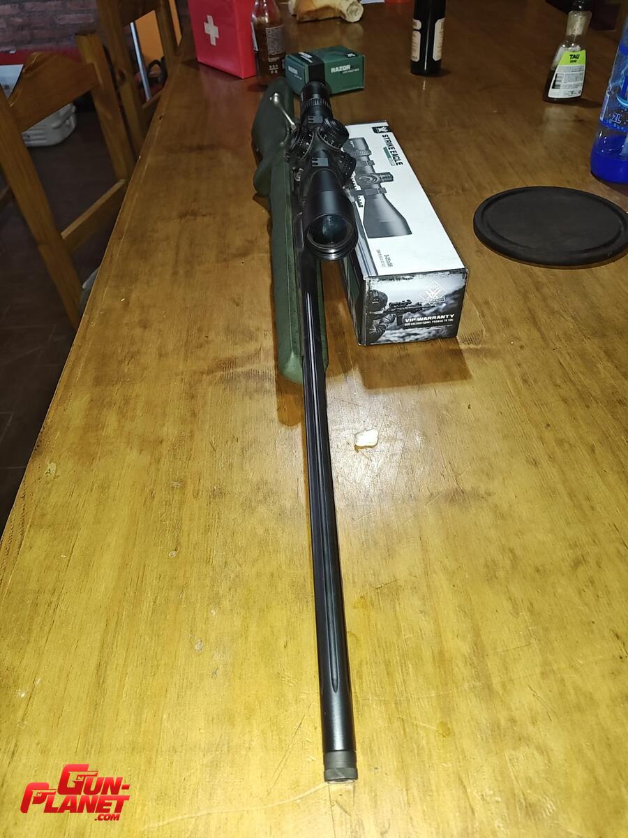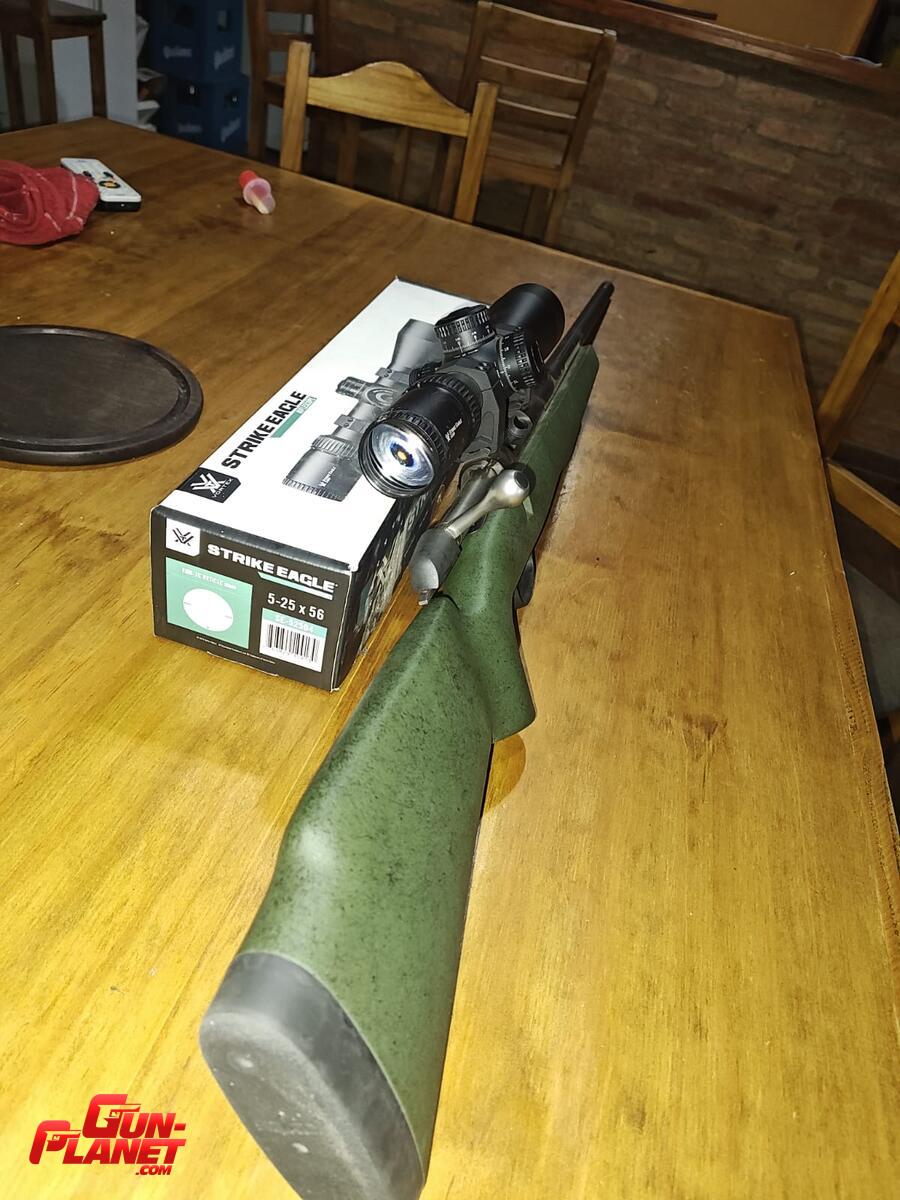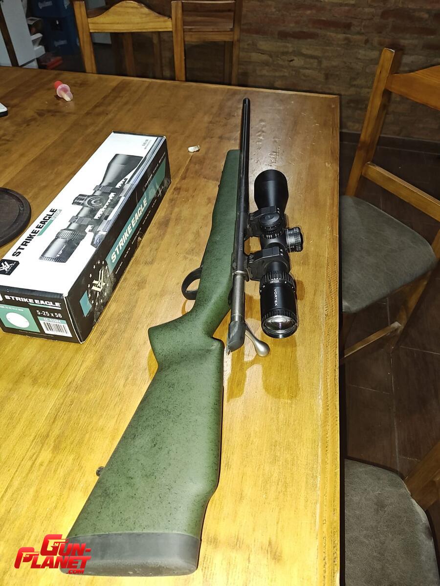 Culata sintética verde texturada.cañon vamint acanalado pavonado. largo de cañón 26". Caño roscado. Cargador desechable. Disparador regulable.incluye bases weaver con mira Vortex strike eagle 5-25x56 y anillas Vortex. Está como nuevo se usó solamente para calibrar la mira....se puede vender sin mira!!!!