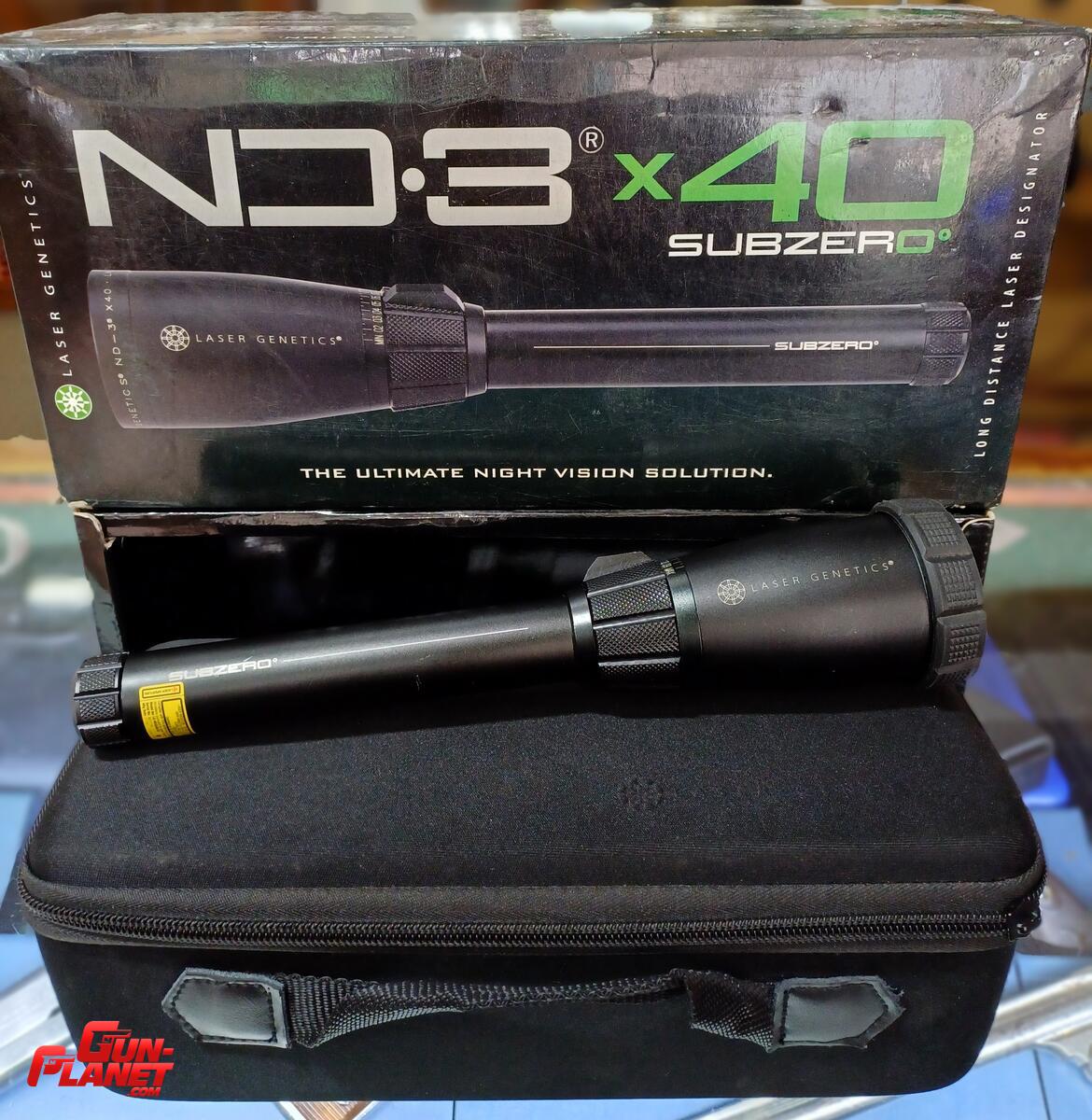 Linterna Laser Genetics ND3X40 SUB ZERO, verde, en caja, estuche, montaje y suitch remoto impecable estado. Para cacería Nocturna