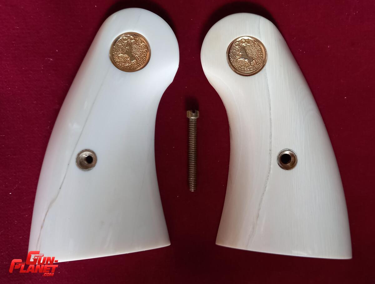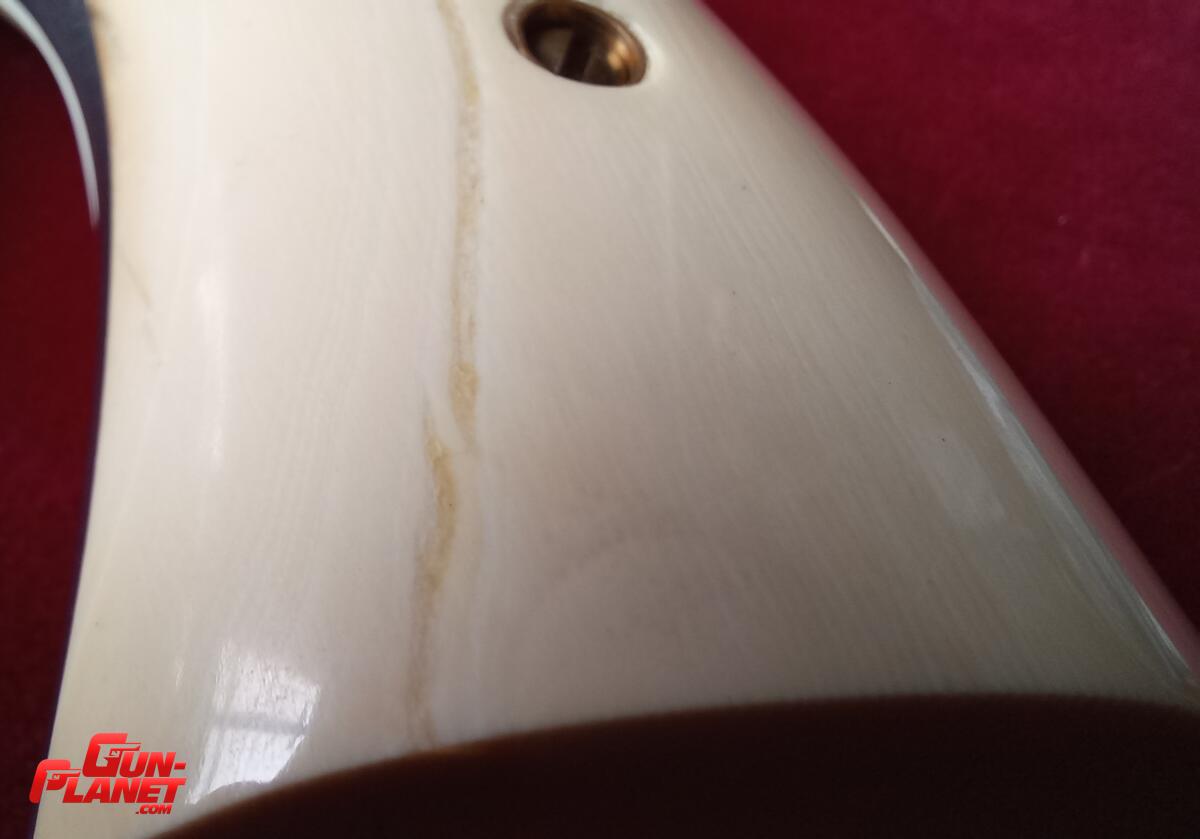 IMPORTANTE: Las líneas que se ven en las cachas son parte del diseño natural de algunos marfíles, no están rajadas ni mucho menos. Dejo una foto donde aparecen otras cachas del mismo material y ahí verá que las líneas son las vetas del marfíl.