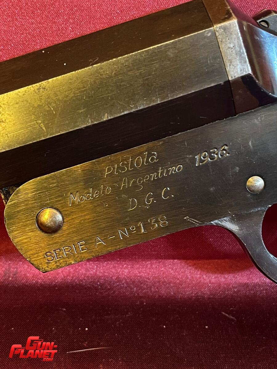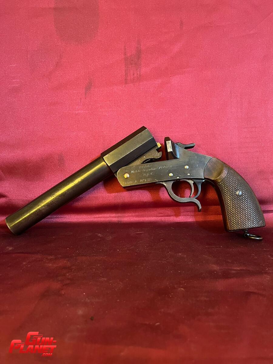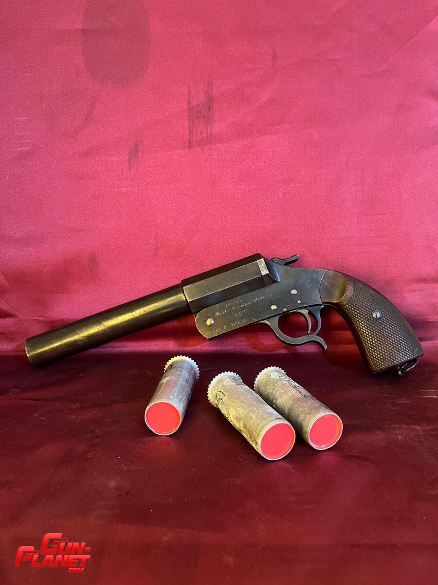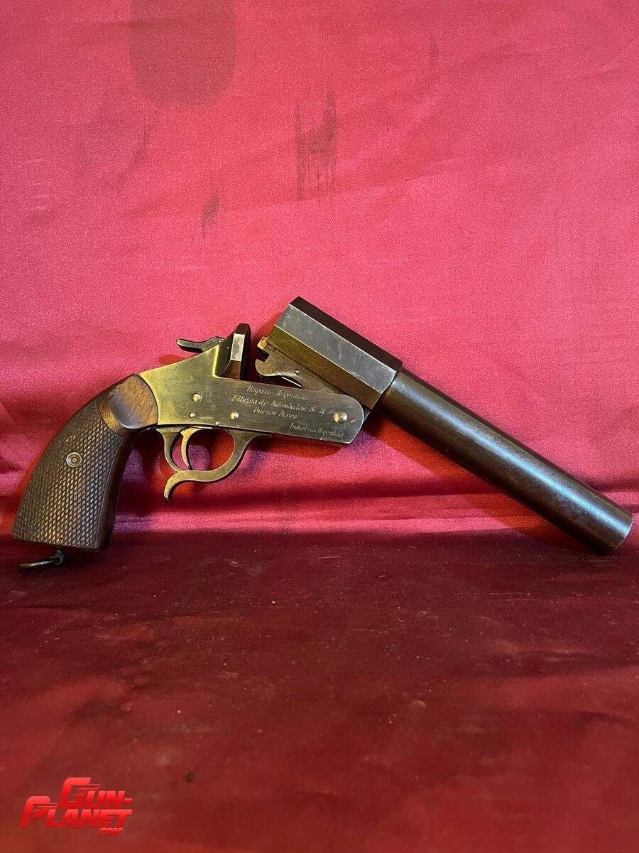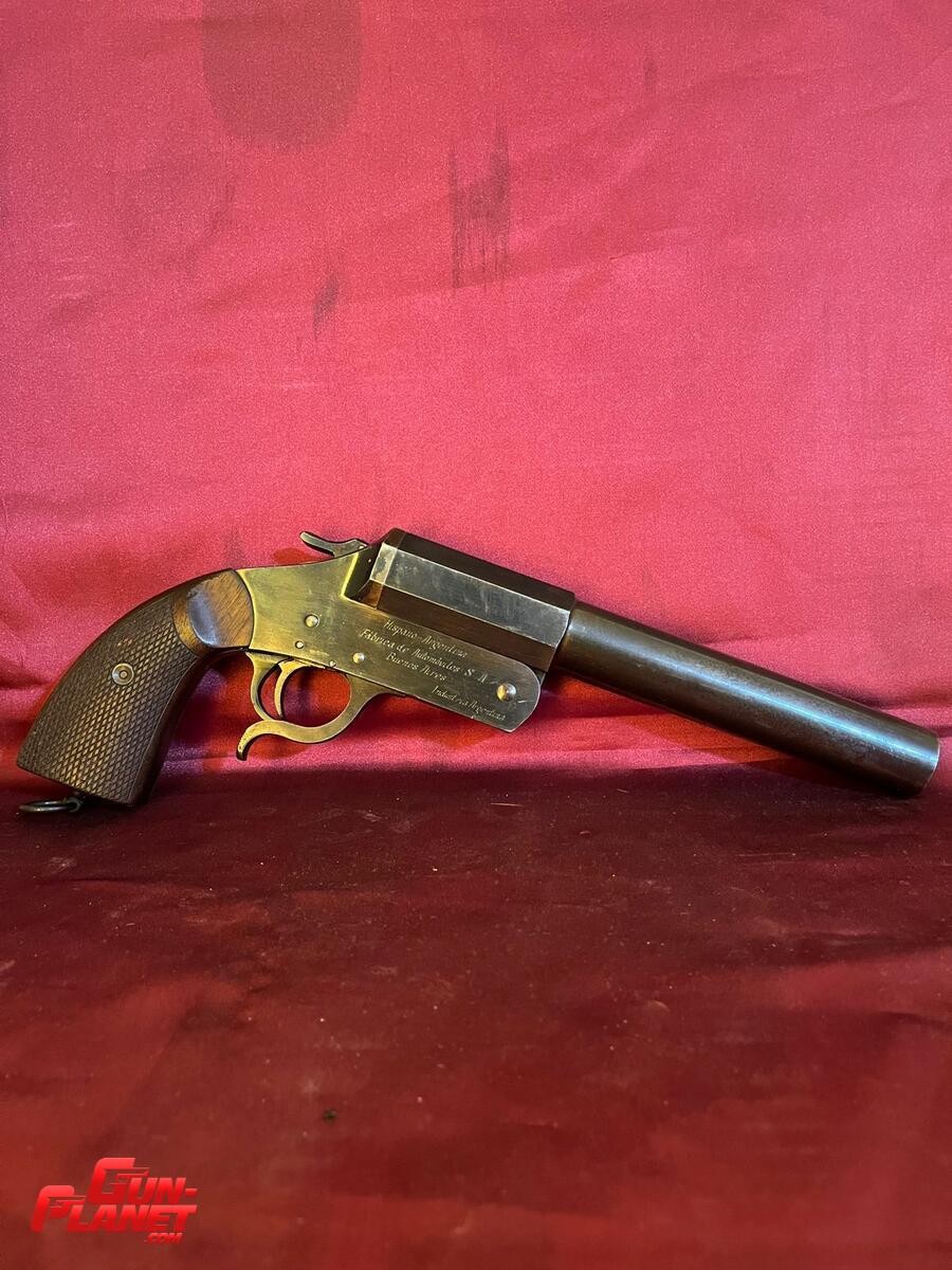 PISTOLA DE SEÑALES NACIONAL DE HAFDASA MODELO CRIOLLO 1936 calibre 26,5mm - Serie A, numero de fabricacion 138 - incluye 3 cartuchos de señales para exhibirla, funda cartuchera original de cuero.