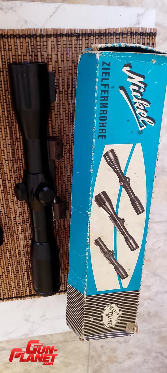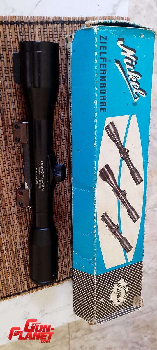 Mira de coliza alemana nikel supra 4x36 Rt 1 muy luminosa con anillas de acero tipo wiver con su respectiva caja original de época .cristales y mecánica de la misma muy buena