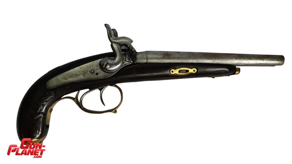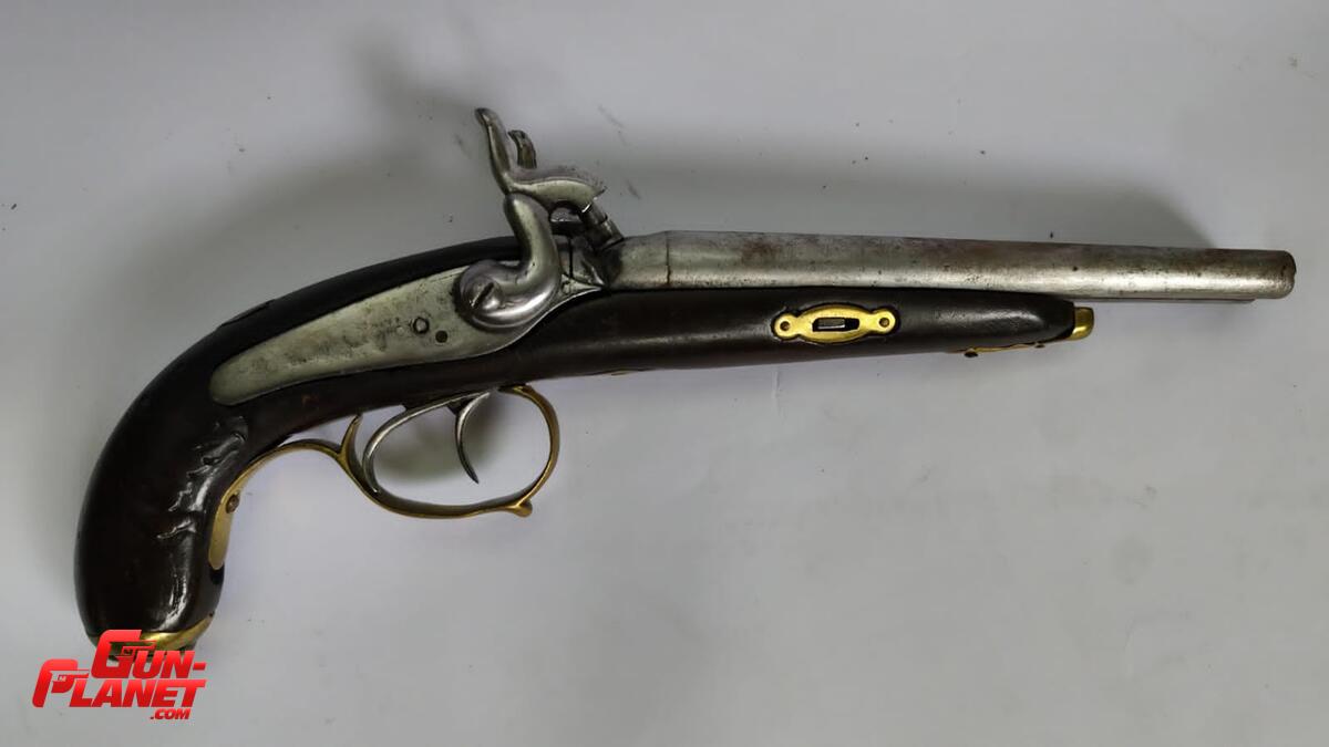 • Descripción y Estado de Conservación: Pistola de percusión de tamaño considerable con dos martillos externos independientes. Culata de madera con forma ergonómica.