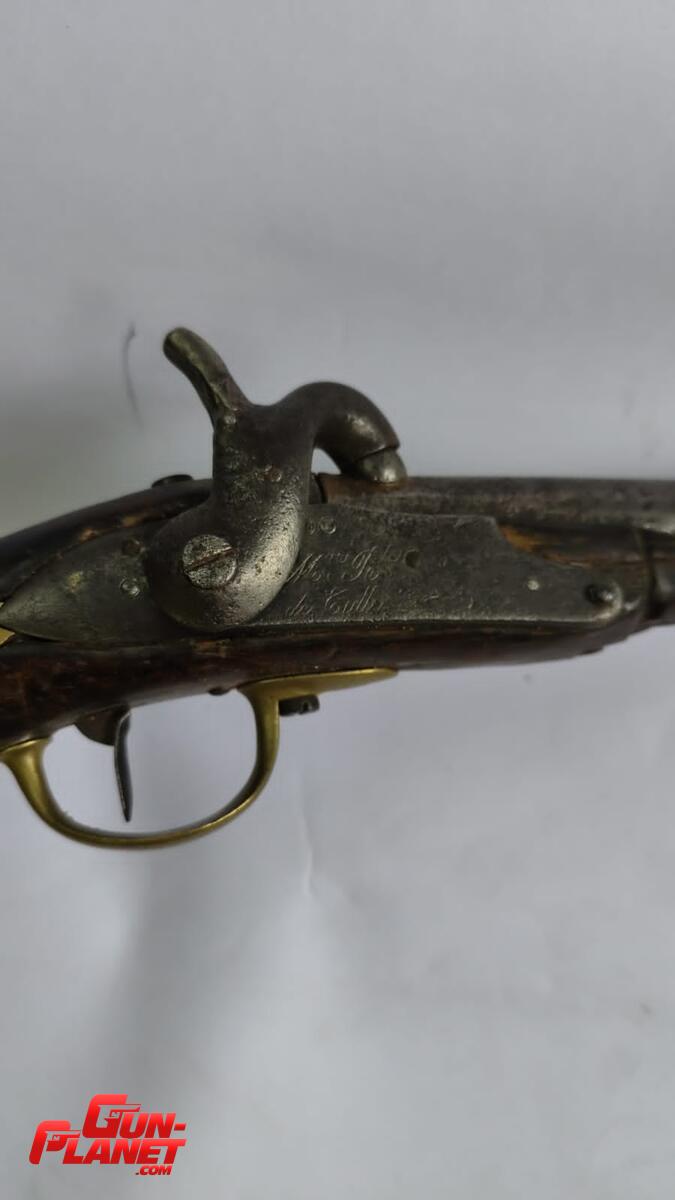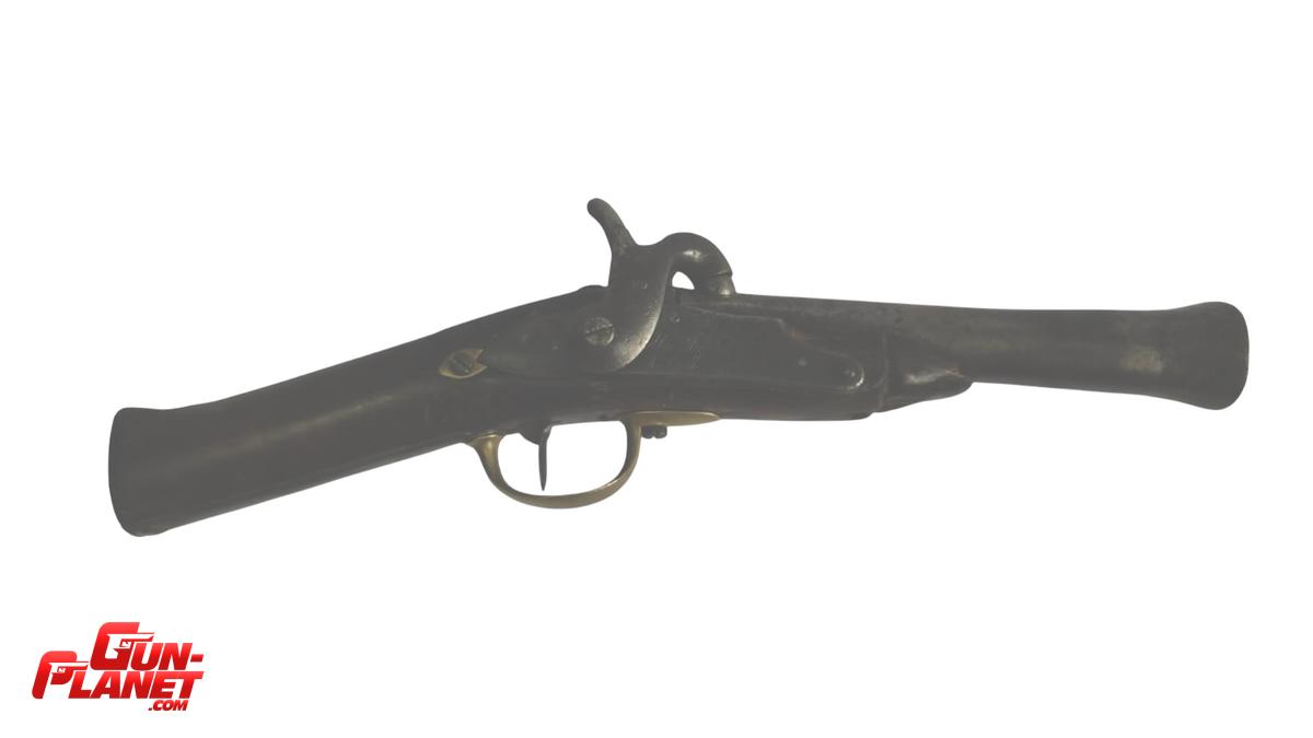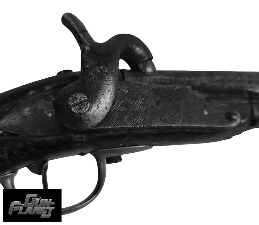 • Descripción y Estado de Conservación: Arma de percusión con un característico cañón corto de gran calibre y boca abocinada, diseñado para disparar postas. Guardamontes de latón y culata robusta.