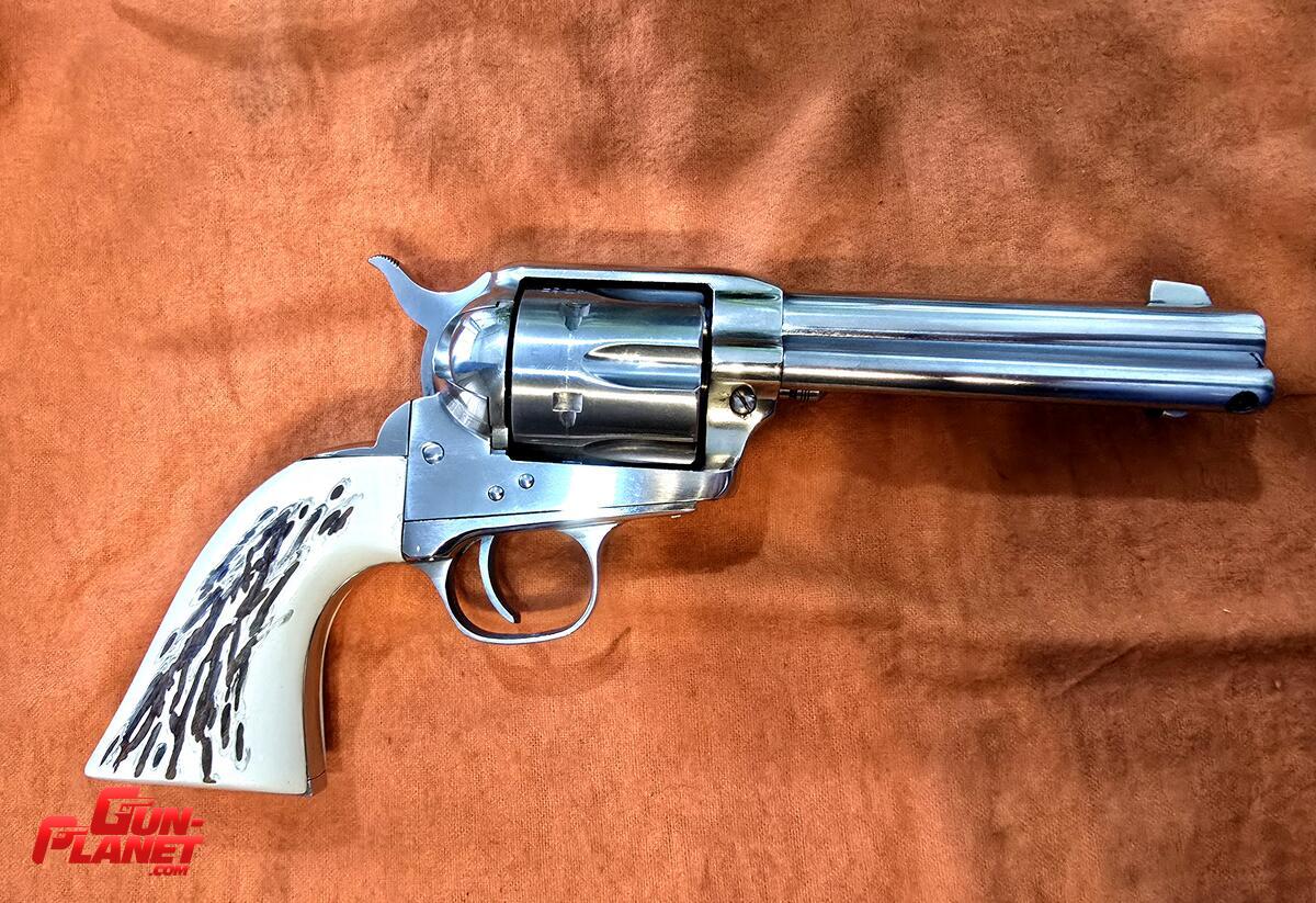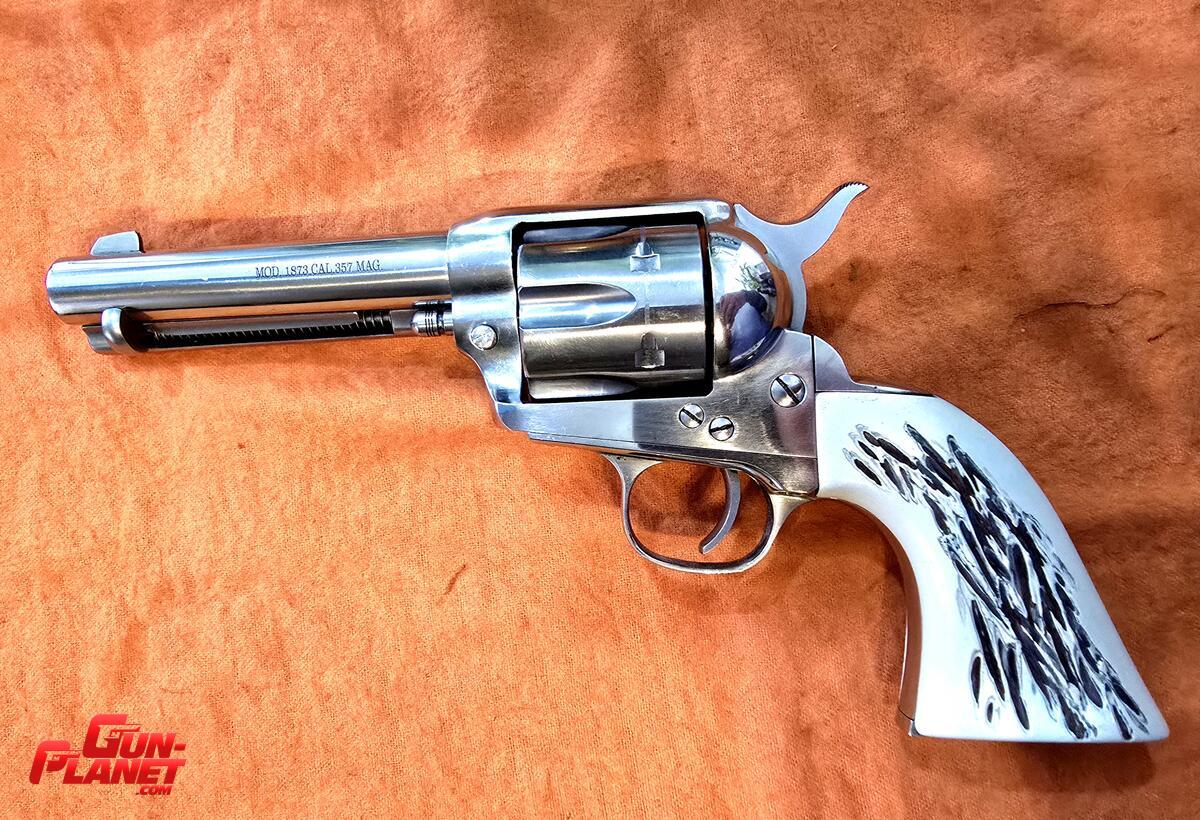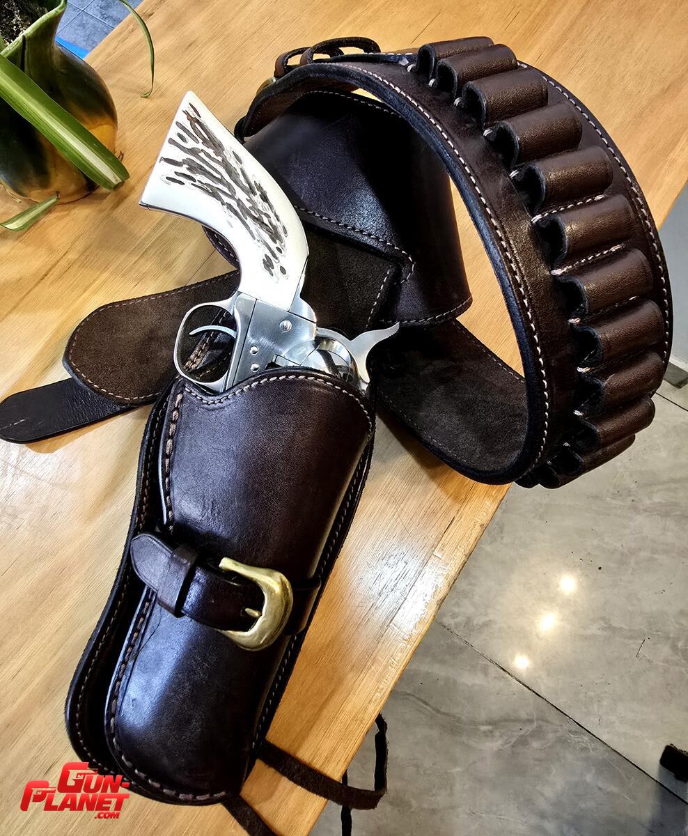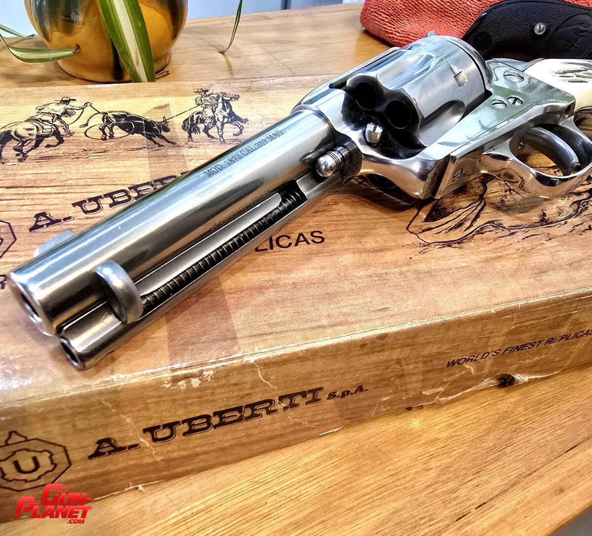 Revolver Uberti simple acción, cal.357 mag, pocos tiros, cachas simil asta de ciervo, con catuchera Berazategui. Estado IMPECABLE