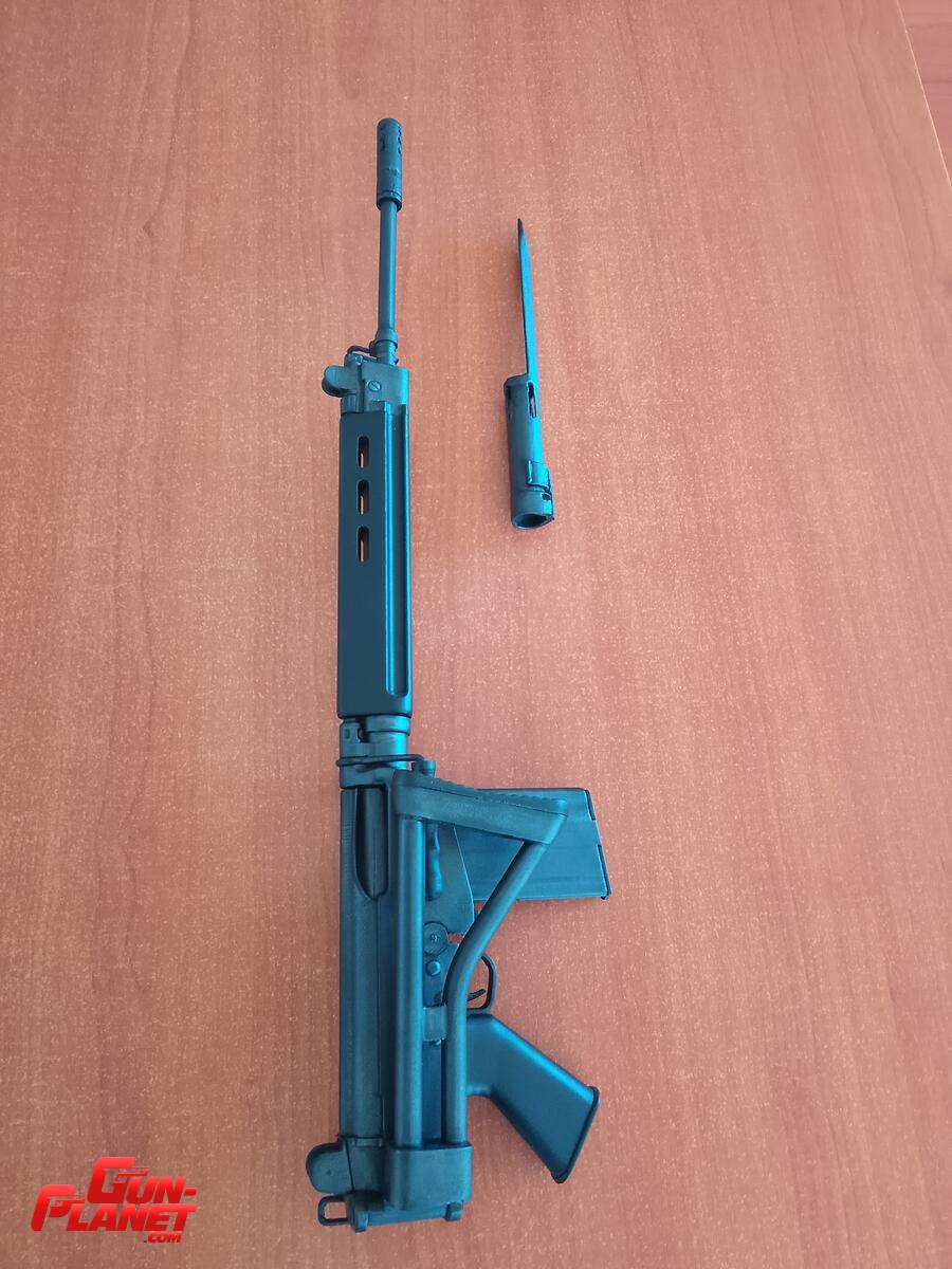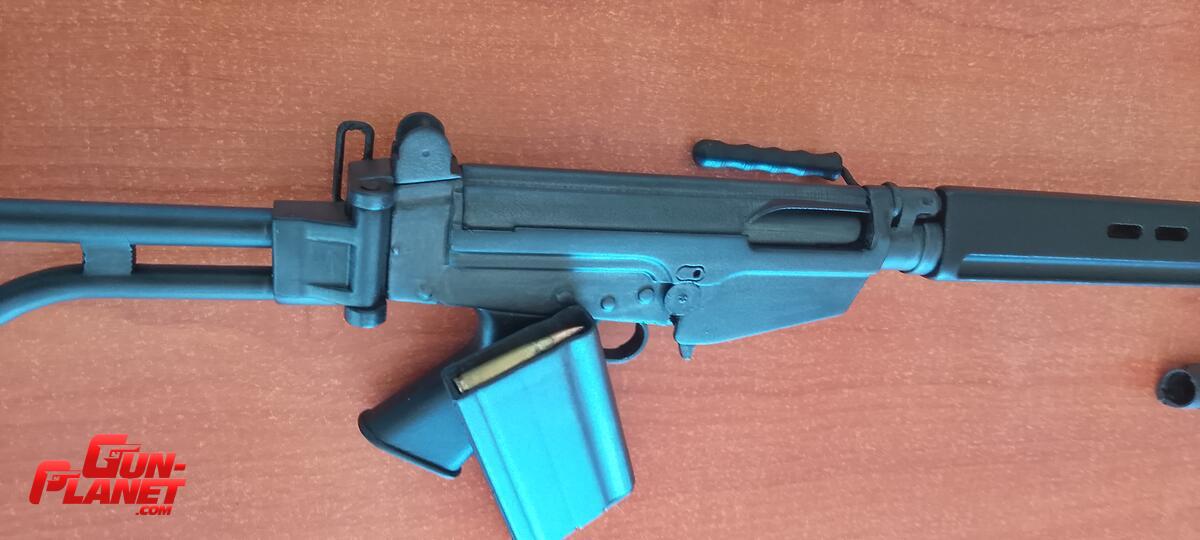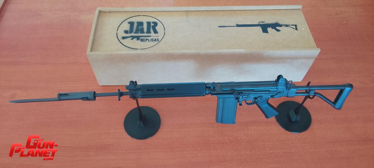 Detallada replica Fal para..esc 1/2. culata rebatible, cargador desmontable, bay. tubular. cerrojo con movimiento. en caja de madera.