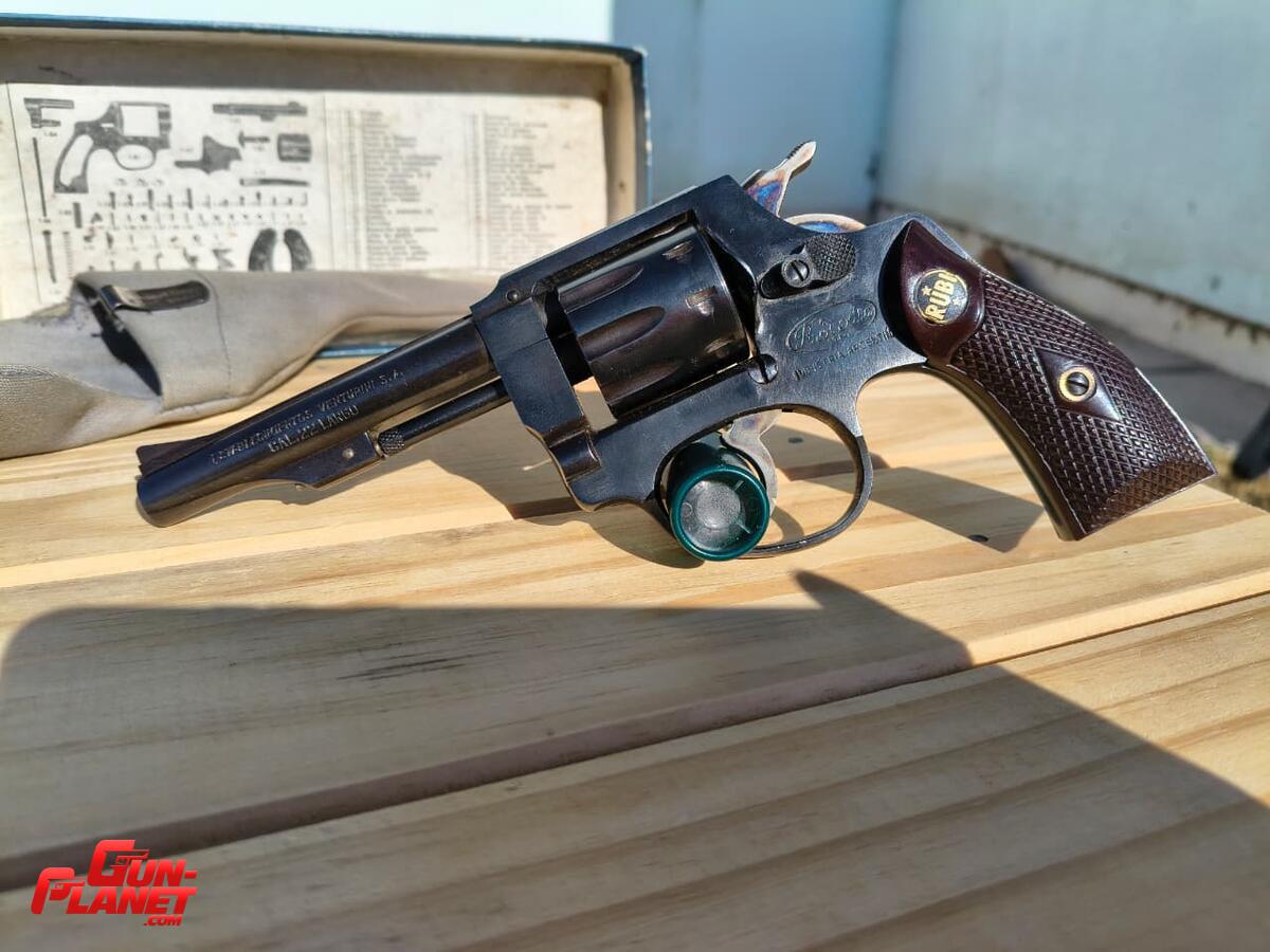 Revolver Rubi .22LR, doble acción, tambor de 9 municiones. Impecable, sin detalles. Se compró por que estaba en muy buen estado, nunca se había disparado, lo dispare por primera vez el año pasado, unas 3 cajas. Tengo la caja original de cartón, funda interna de lona original y la baqueta para limpieza.