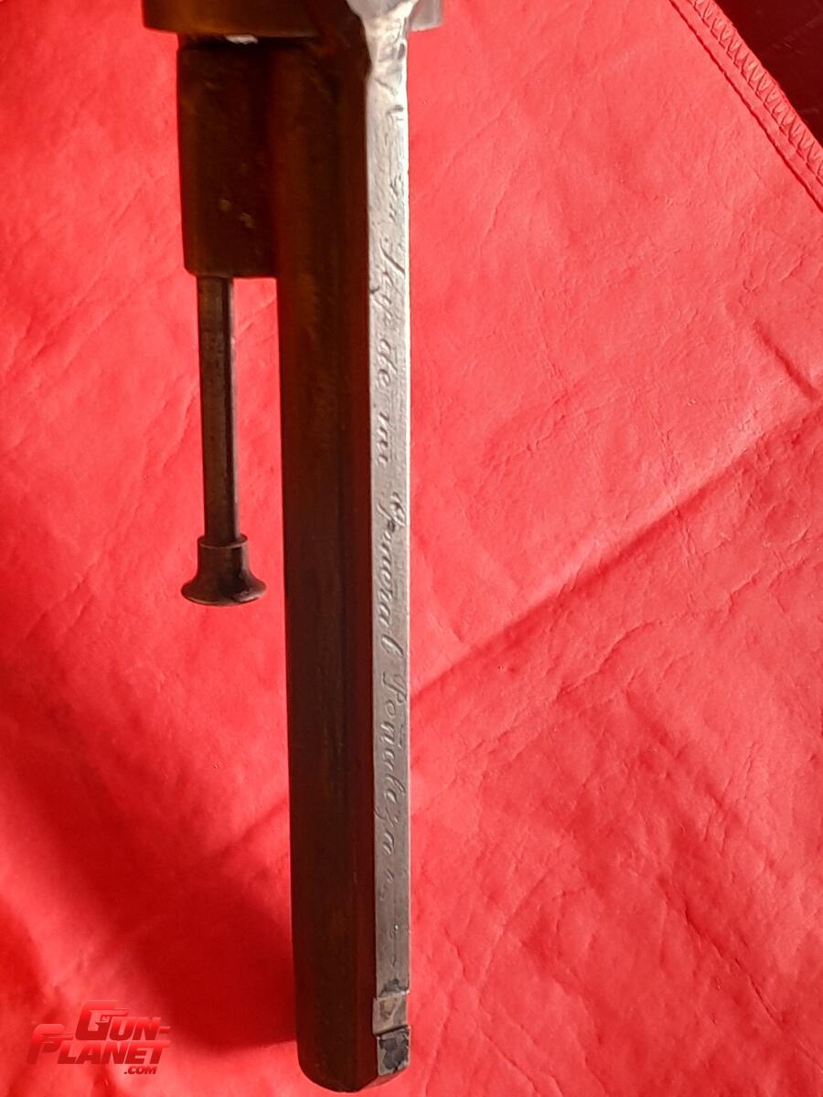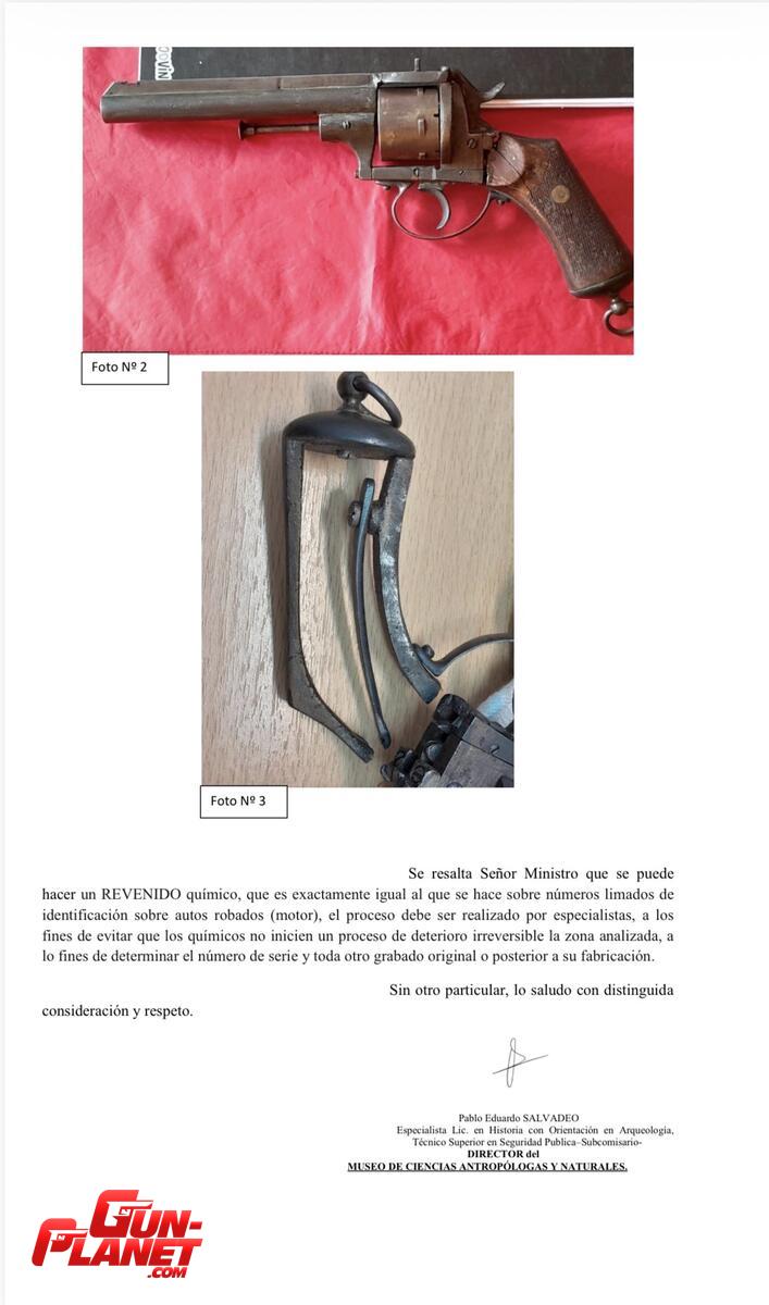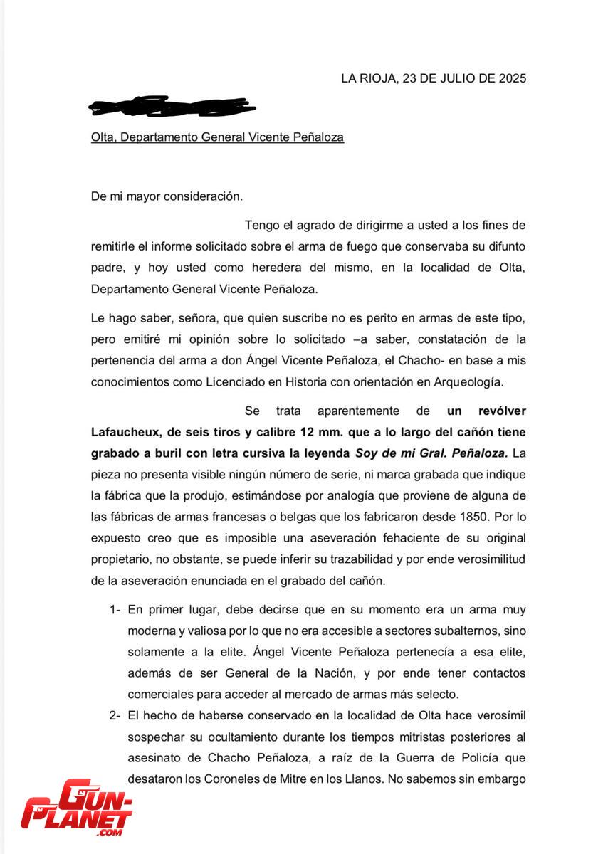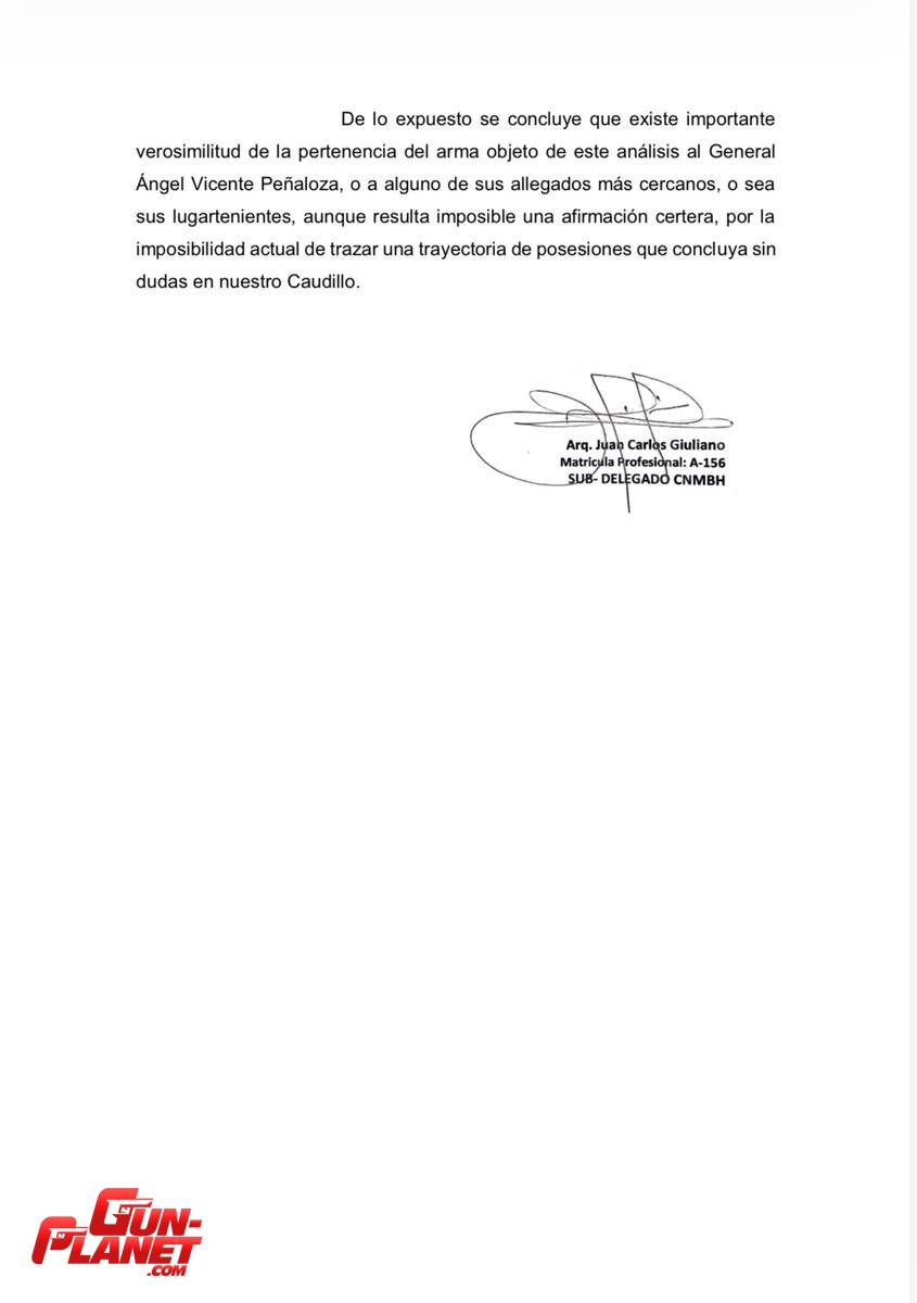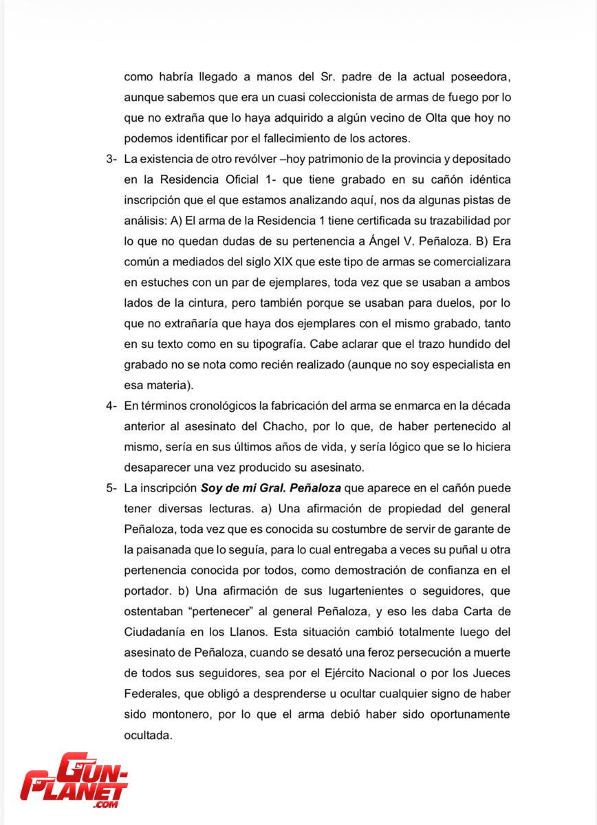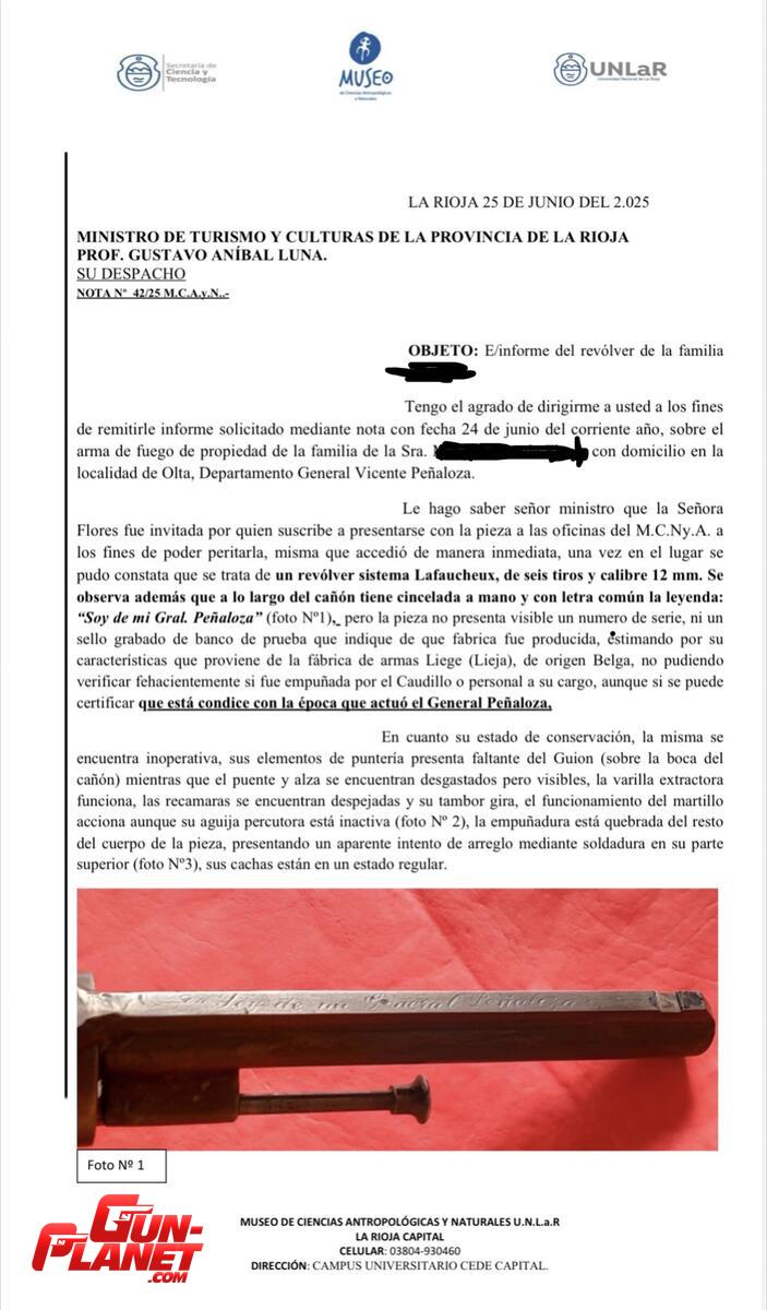 Revolver sistema Lafaucheux de seis tiros calibre 12 m m . A lo largo del cañón tiene grabado con letra cursiva la leyenda Soy de mí General Peñaloza. Existe importante versosimilitud de la pertenecía del arma al General Angel Vicente Peñaloza El Chacho