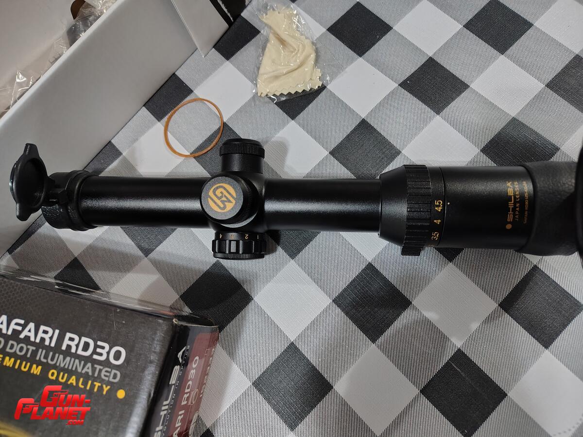 Shilba Safari RD de 1.25 a 4.5 x 24 tubo de 30mm retículo 4 punto central iluminado. La mira esta impecable, casi no se usó. Se va con su caja original, tapas flip y manual. NO SE ACEPTAN PERMUTAS.