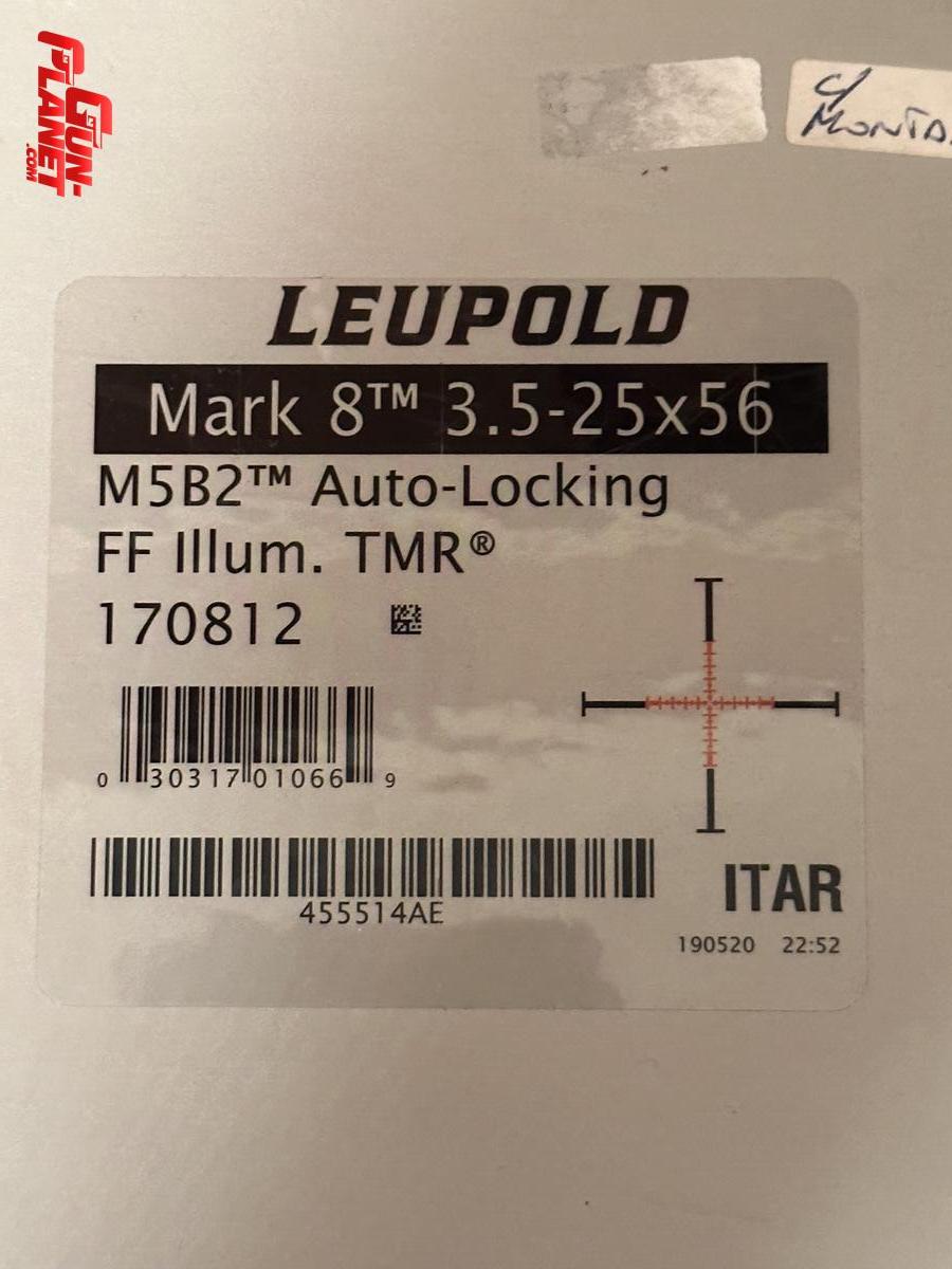 1) Mira Leupold Mark 8 3.5-25 x 56 nueva sin uso, con montaje específico Leupold para picatinny (parte 170812 https://www.leupold.com/mark-8-35-25x56-m5b2-illum-ffp-tmr-riflescope). USD 5000.