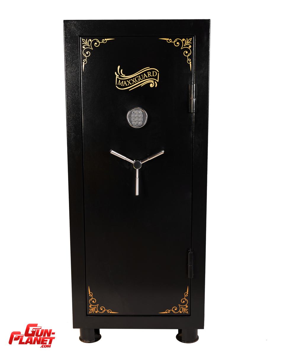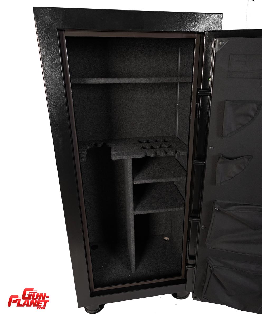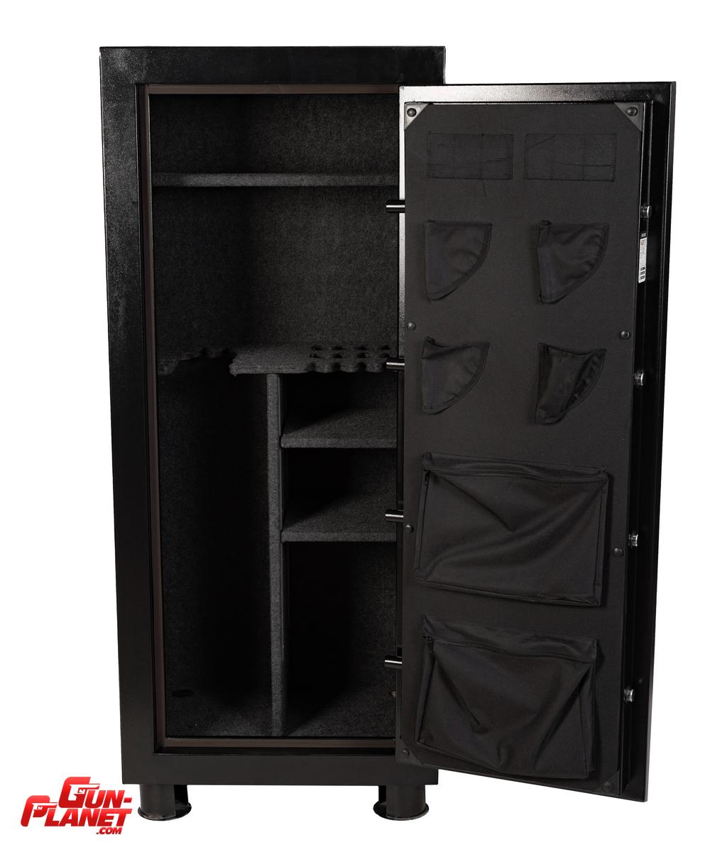 Armero con capacidad máxima para 22 armas largas, complementada con un kit organizador con bolsillos en la puerta para accesorios adicionales y protección contra el fuego.
