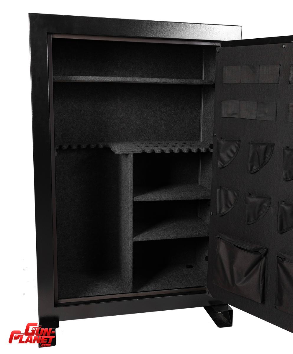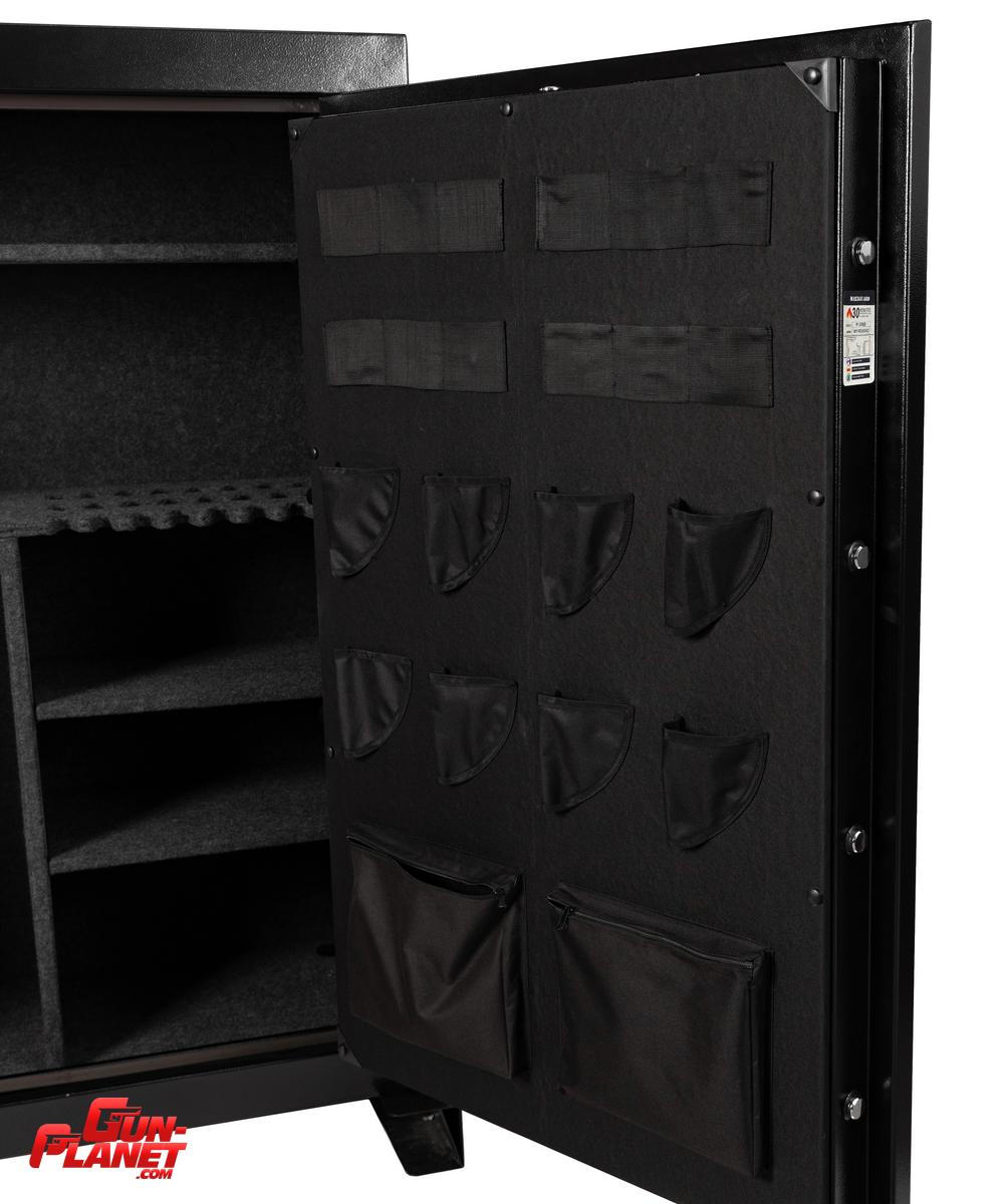 Armero con capacidad máxima para 40 armas largas, complementada con un kit organizador con bolsillos en la puerta.