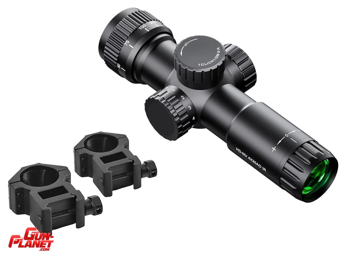 GOTICAL Proporciona un combo de 3 artículos que incluye, lente objetivo de alcance compacto AO 4x30, anillos de enfoque y alcance ajustables Parallax y soporte de alcance de silla de montar para 12GA 870.