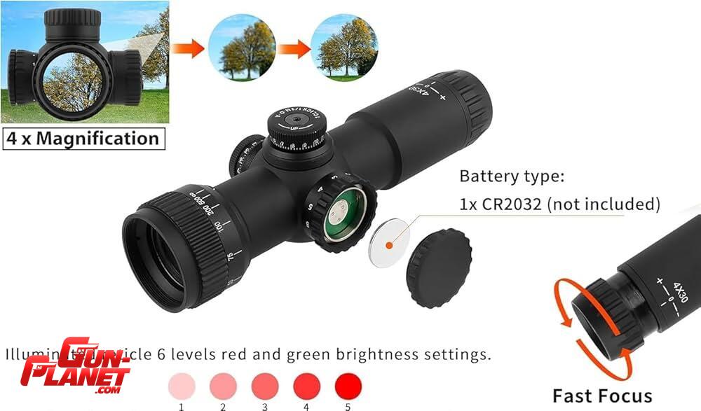 Alcance corto tipo AO: El alcance GOTICAL es de solo 6,5 pulgadas (6.5 in), pesa 1,8 libras (0.7 lbs), súper compacto. La mira de alcance 4x30AO permite un ajuste de paralaje para enfocarse en la lente del objetivo. 4x x aumento fijo 1.181 in tubo diámetro aluminio para airsoft y caza