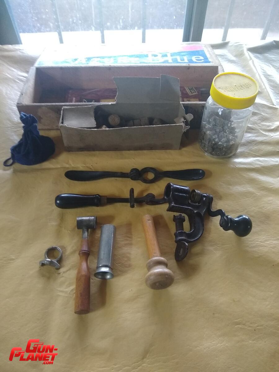Rebordeadora cartuchos cal 16 y otros antiguos artículos de recarga . 70 vainas cal 36. Dos perdiceras y canana cal 16