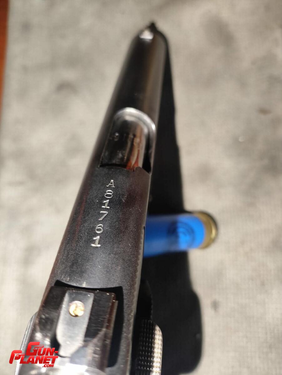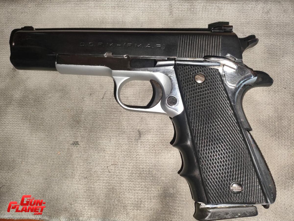 Pistola FM 1927 Calibre 45 ACP Bitono, ien excelente estado, Alza de combate con dos puntos, guión de combate con punto, corredera pavonada alcalino, seguro de aleta ambidiestro extendido, cachas colocadas genéricas anatómicas, mas juego de cachas vaquelita negra mas cachas vaquelita con bandera argentina, dos cargadores de 7 municiones uno con apoya dedo (colocado en fotos) y otro común escucho ofertas