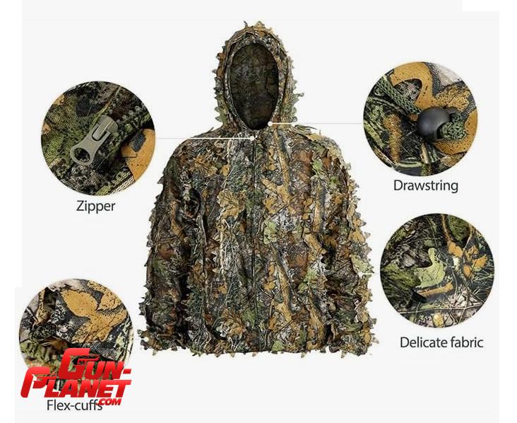 La nueva serie Outfitter de Titan 3D toma como base su traje 3D Leafy Suit y lo mejora. Confeccionado con un material similar al de la ropa militar BDU, es suave y silencioso. Incluye cremalleras de 45 cm en los bajos del pantalón para ponérselo fácilmente sobre las botas y una máscara facial antimosquitos extraíble. Este traje es fácil de usar y se puede personalizar según tus necesidades. ¡Su exterior de hojas disimula la silueta humana, haciéndote invisible para los animales!