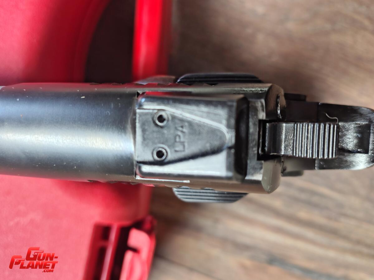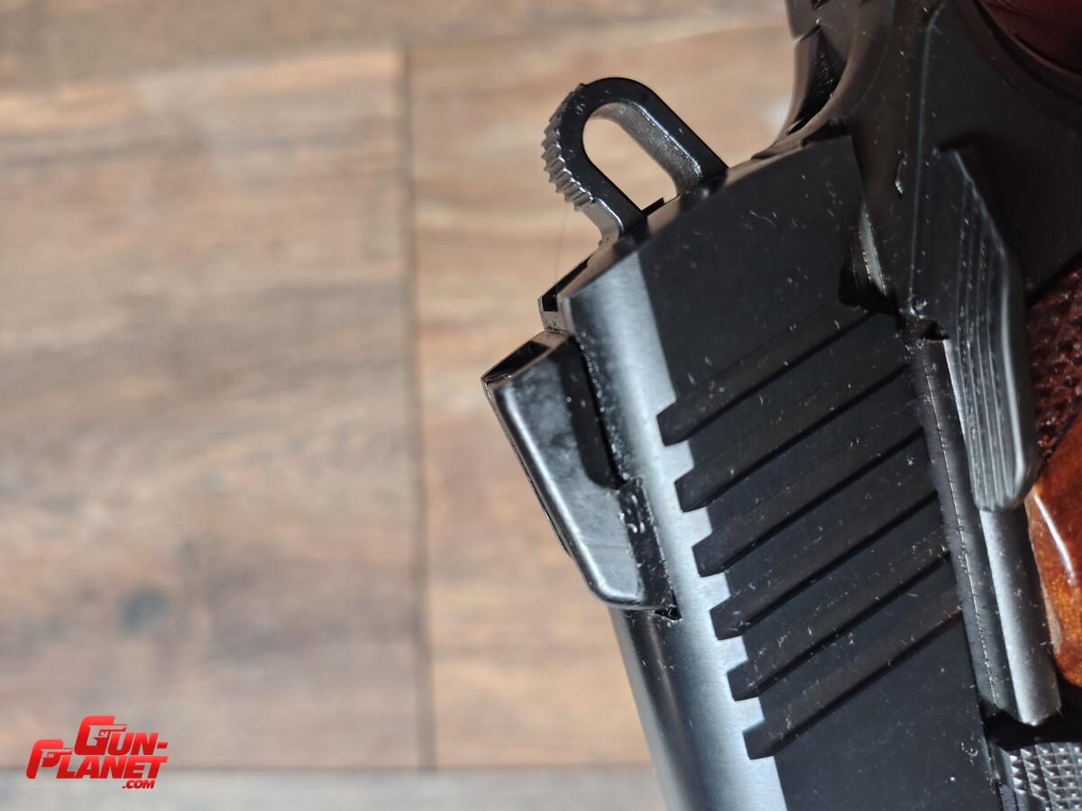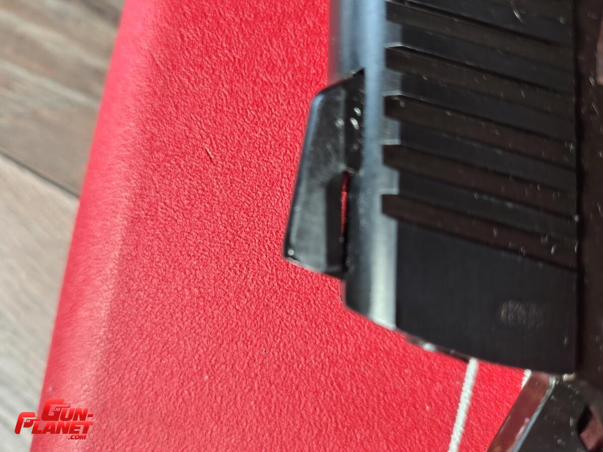 Detalle - al instalarle un alza ajustable (se reinstalo la fija original ) la misma exigio limar la parte inferior trasera de la base novak y borde superior trasero de corredera que suele encapsular al alza fija de dicho modelo .