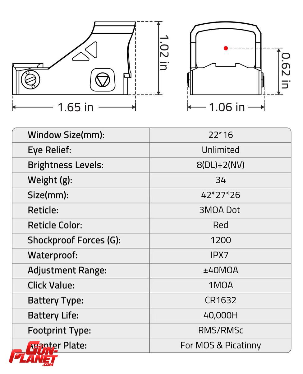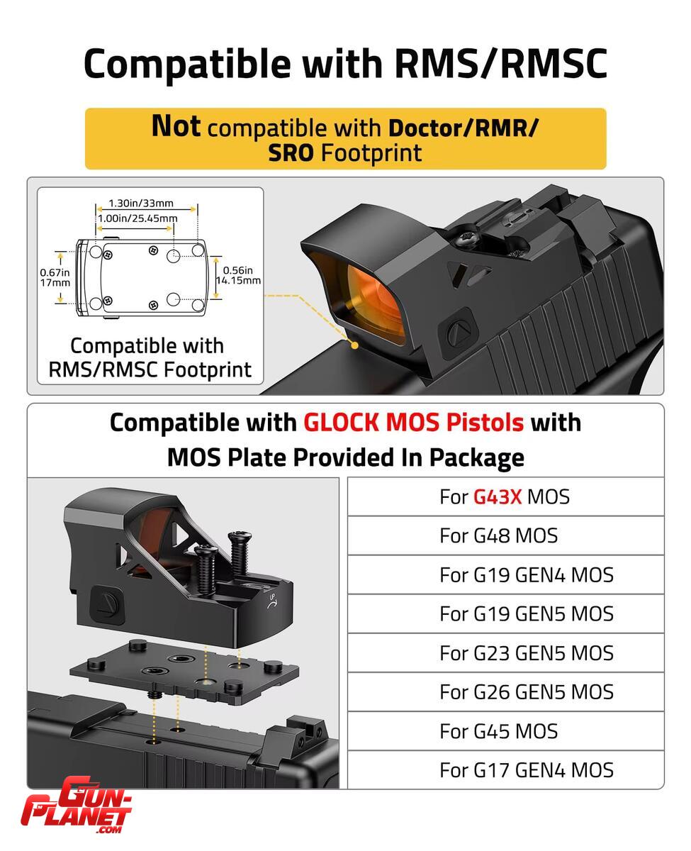 Compatible con RMS/RMSC: La mira de punto rojo es compatible con monturas o placas de montaje RMS/RMSC. Esta óptica de punto rojo compacta viene con una placa adaptadora para MOS y una base Picatinny.