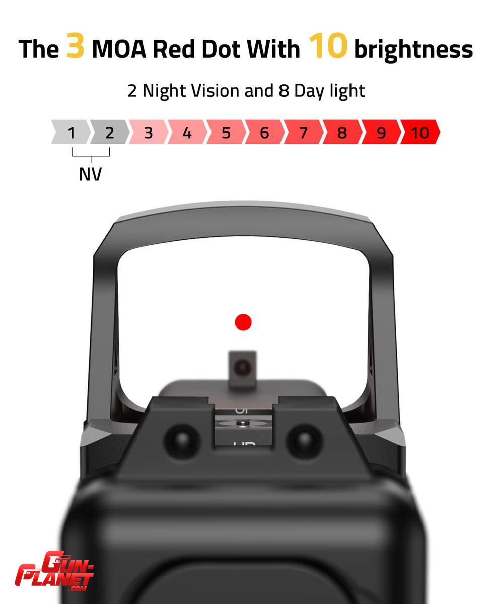 Adquisición Rápida de Objetivos: Equipado con un punto rojo de 3 MOA y 10 niveles de brillo (incluyendo 2 modos NV), este visor de punto rojo ofrece una precisión de apuntado desde condiciones de luz diurna hasta entornos de baja luminosidad.