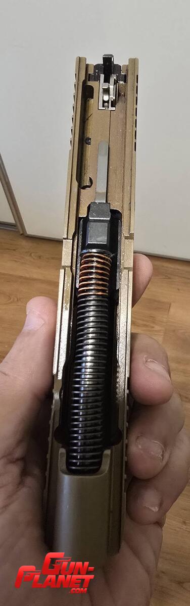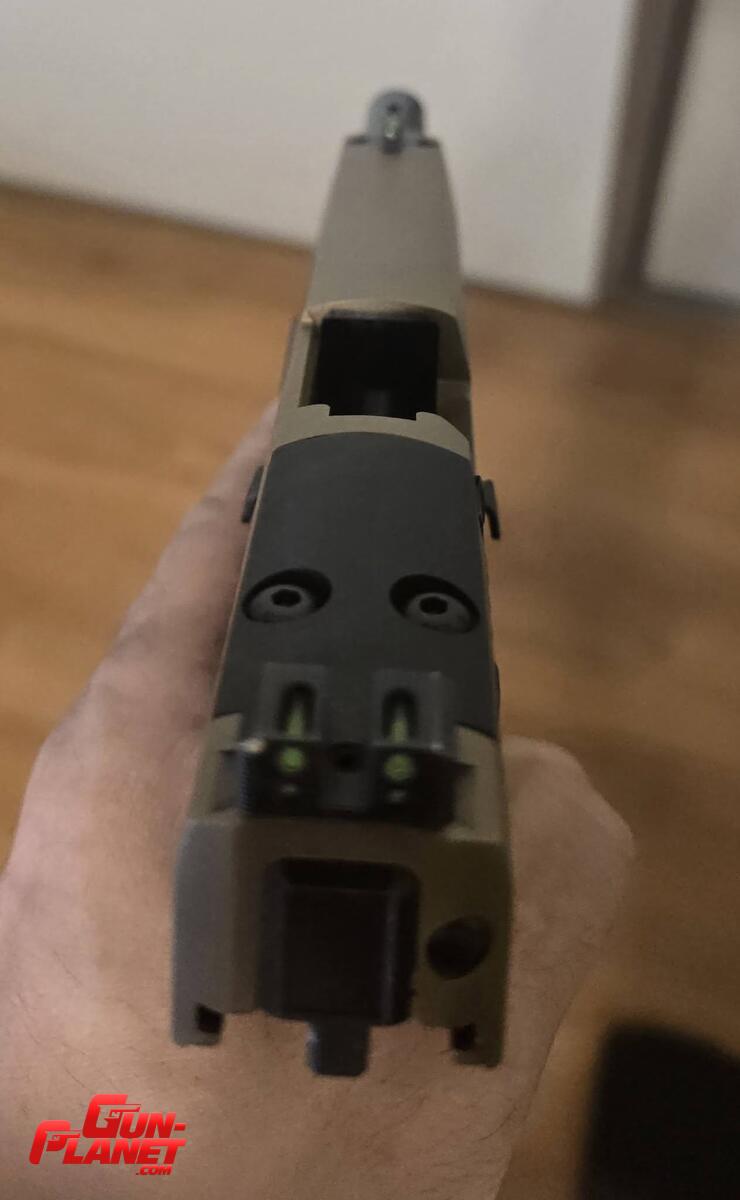 Corredera Optic-Ready: La corredera de acero inoxidable cuenta con un acabado en Coyote PVD (FDE), serraciones frontales y traseras, mejorar el acerrogamiento.