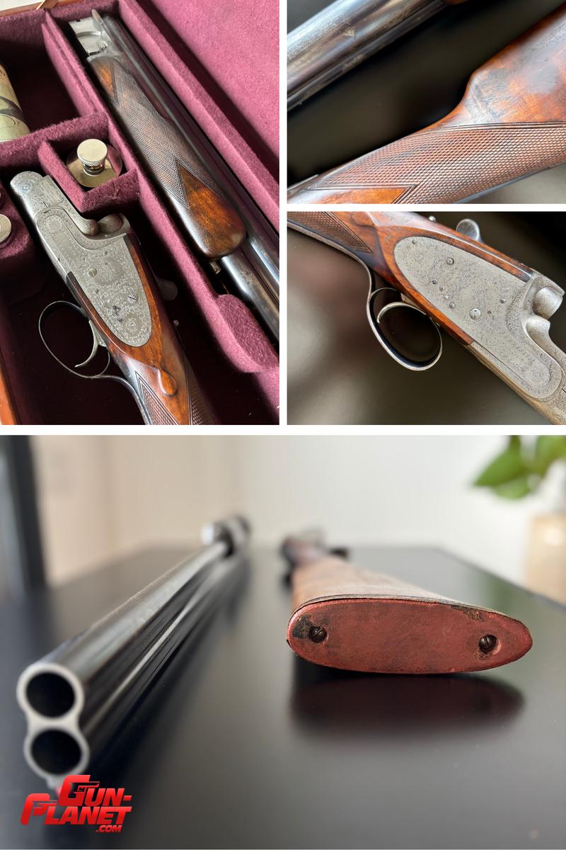 Accesorios: Estuche de cuero con esquinas de bronce; juego adicional de resortes principales y percutores. Pavonado 70% Barrenado 18.5. Platinas largas Holland.