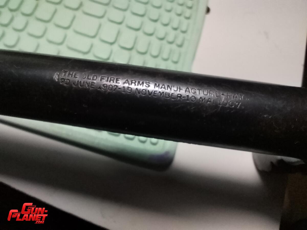 >> La verdad no sabría decirte el origen de fabricación . Otro usuario también me preguntó y le escribí la inscripción que dice en el caño . Ya subo una mejor foto de la inscripción.(The old fire arms manufacture -pat- 20 june .907 -19 november - 20 may 1907)