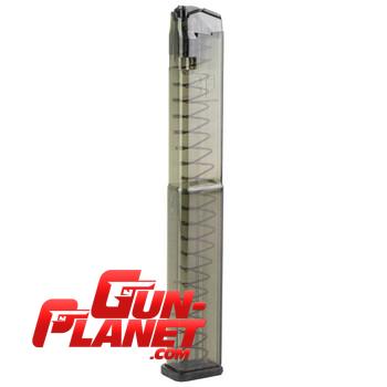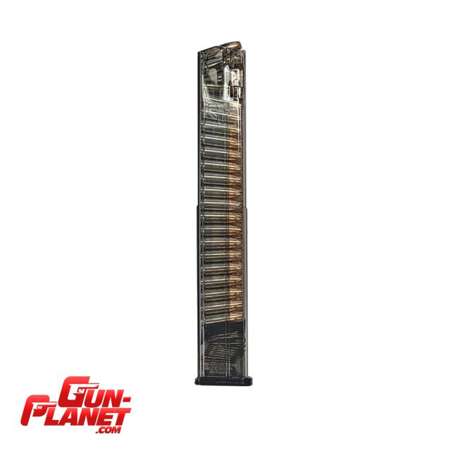 Este cargador de alta capacidad fabricado por ETS (Elite Tactical Systems) es una de las opciones más populares para usuarios de Glock que buscan maximizar su volumen de fuego. Utiliza un polímero avanzado translúcido con un acabado "Carbon Smoke" (ahumado) que permite ver claramente la cantidad y el tipo de munición restante.