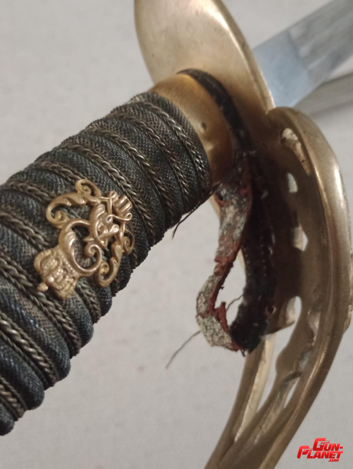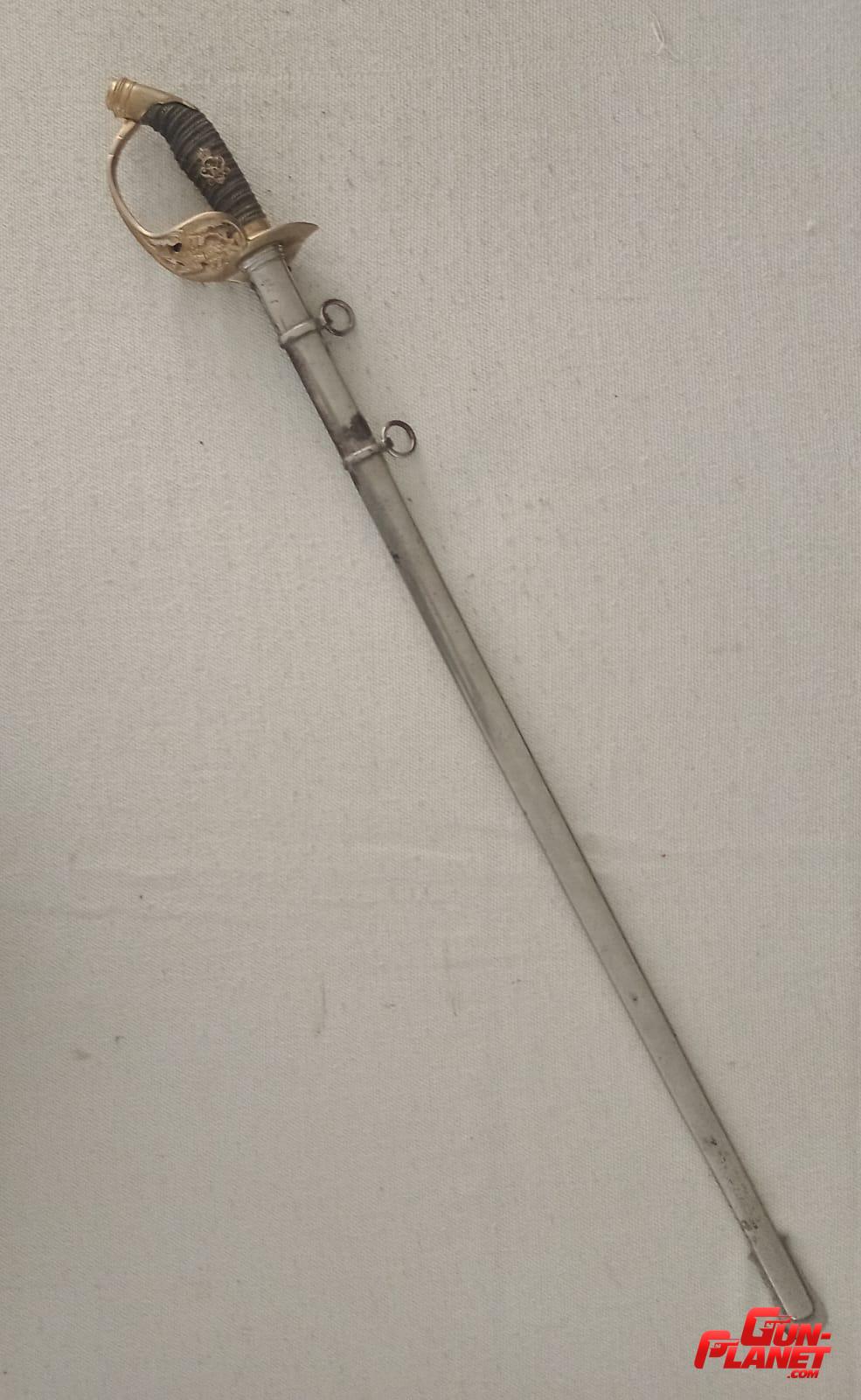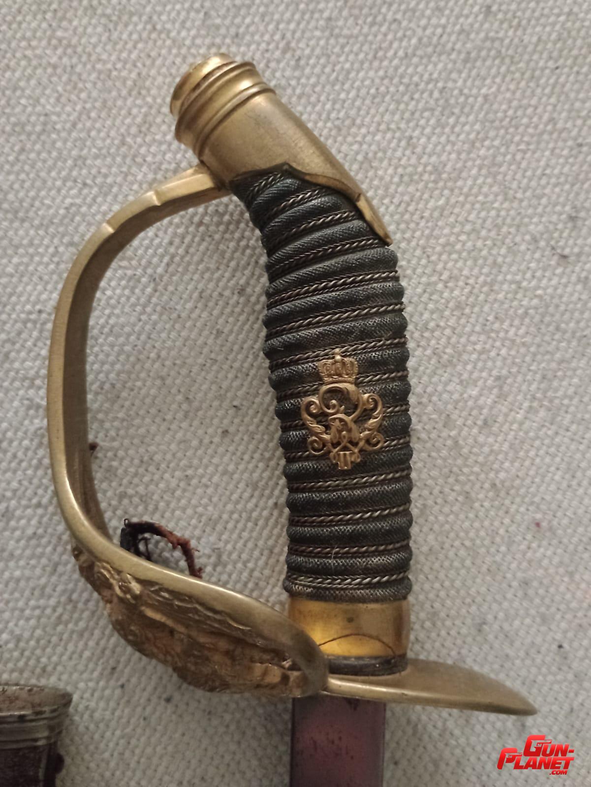 Fabricada en Alemania a finales del siglo XIX La empuñadura es de latón, y lleva guardamano con el águila prusiana grabada en relieve con el monograma del emperador Guillermo II El puño de piel de raya conserva la lija y el torzal originales, está decorado con el monograma del emperador Guillermo II, que también aparece en el águila. La vaina con dos anillas está completa y en buen estado, si bien muestra ligeros signos del paso del tiempo, en modo alguno no interfieren en la belleza y la autenticidad de la pieza.