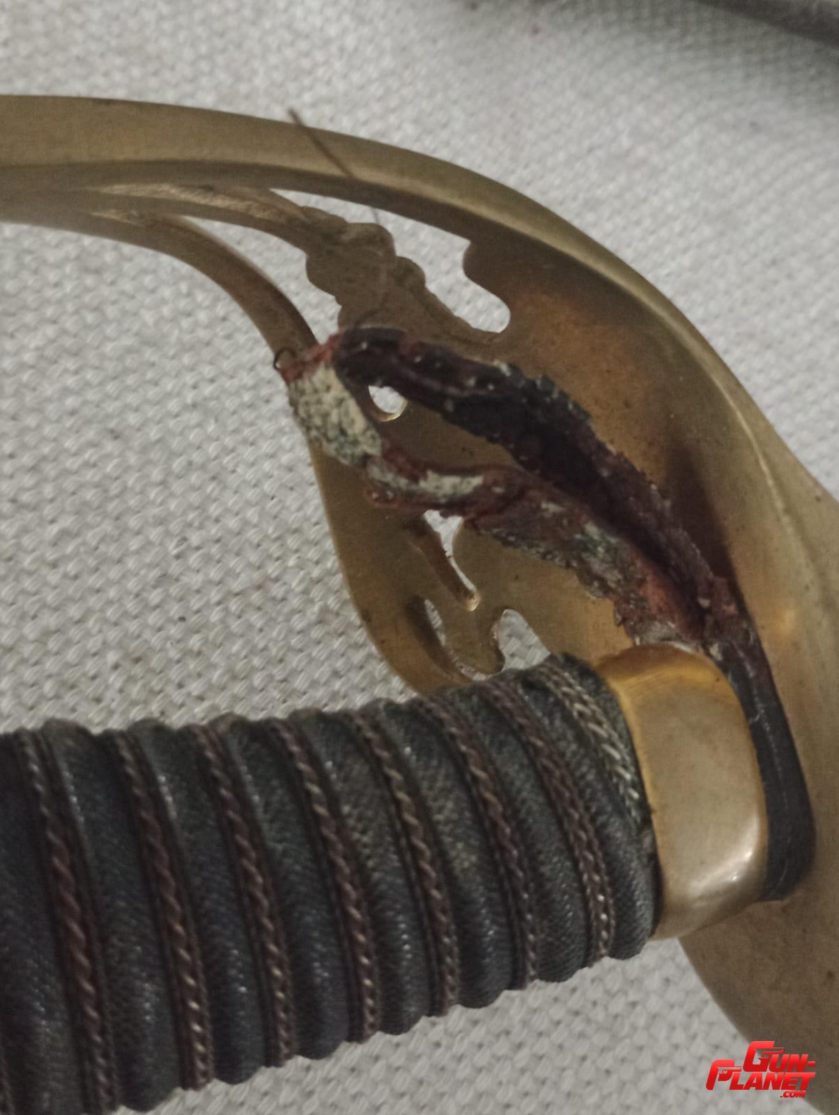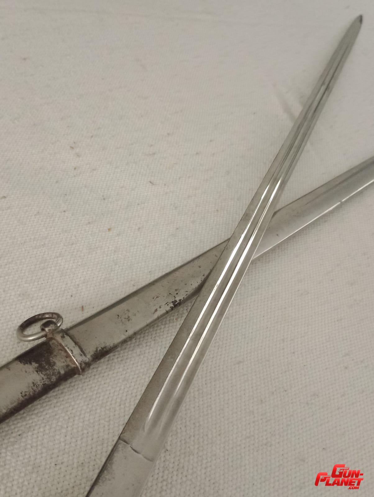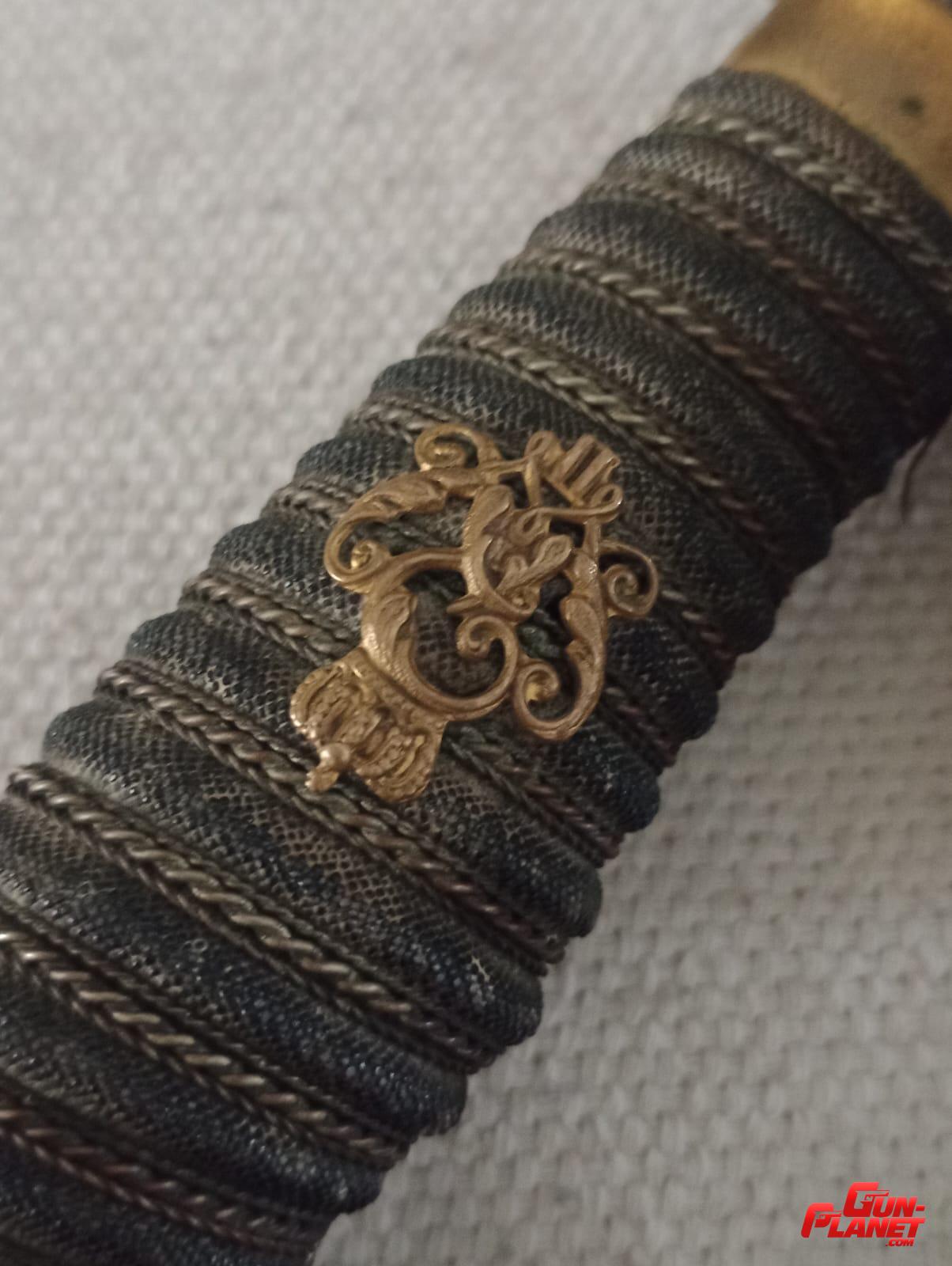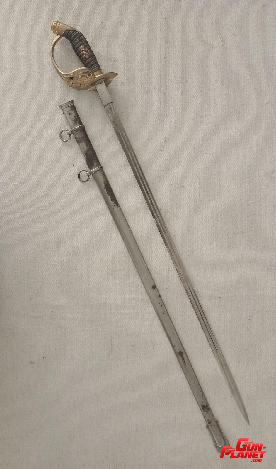 Fabricada en Alemania a finales del siglo XIX La empuñadura es de latón, y lleva guardamano con el águila prusiana grabada en relieve con el monograma del emperador Guillermo II El puño de piel de raya conserva la lija y el torzal originales, está decorado con el monograma del emperador Guillermo II, que también aparece en el águila. La vaina con dos anillas está completa y en buen estado, si bien muestra ligeros signos del paso del tiempo, en modo alguno no interfieren en la belleza y la autenticidad de la pieza.