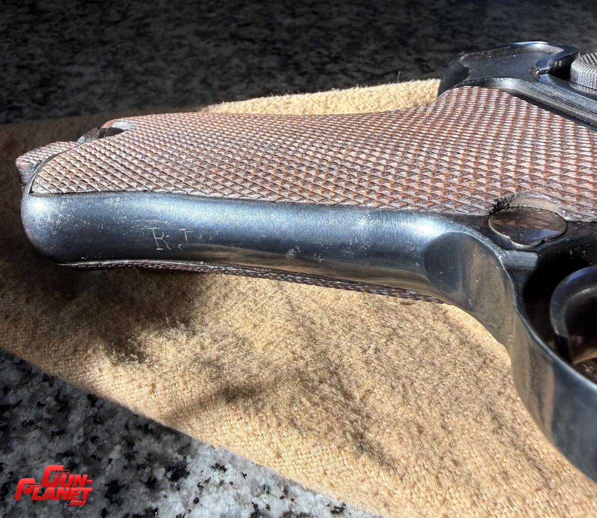 >> Estimado, buenas tardes. Viendo en detalle la pistola logre encontrar en el frente de la empuñadura las letras R J y sobre el canto delantero (por lo que entendí) tiene alguna inscripción.